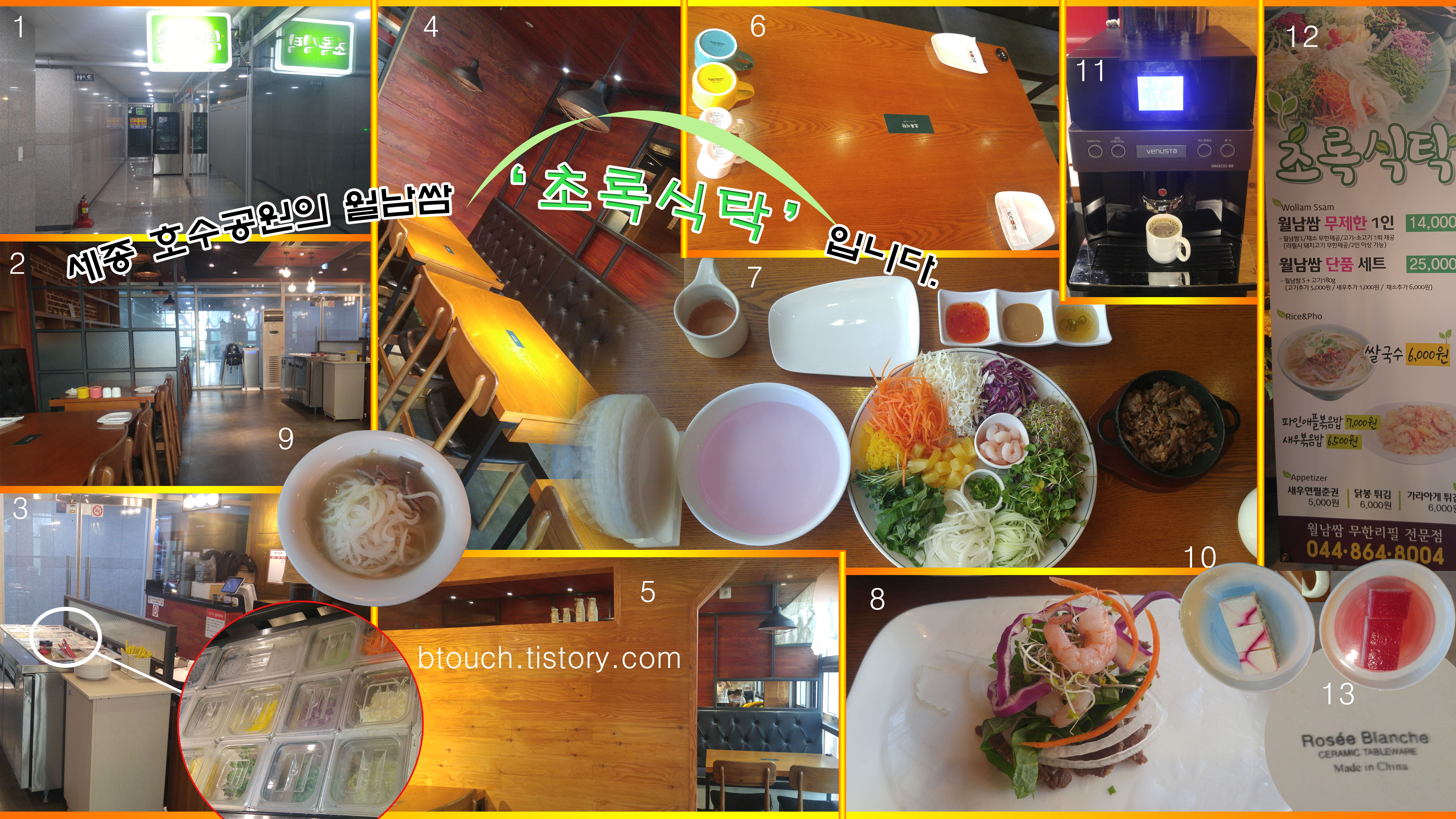 드디어 세종시에서 밥 먹을 데를 찾았습니다. 역시 초행길에서 먹는 곳 찾기가 쉽지 않습니다.^^; 백종원의 본가를 찾아갔다가 위층에 있는 월남쌈 '초록식탁'을 보고 이왕이면 채소가 많은 곳으로 갈아탔습니다.