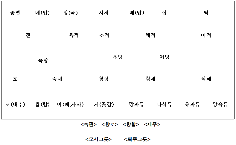 과일이나 조과의 붉은색을 동쪽으로 놓고 흰색은 서쪽으로 놓는다.