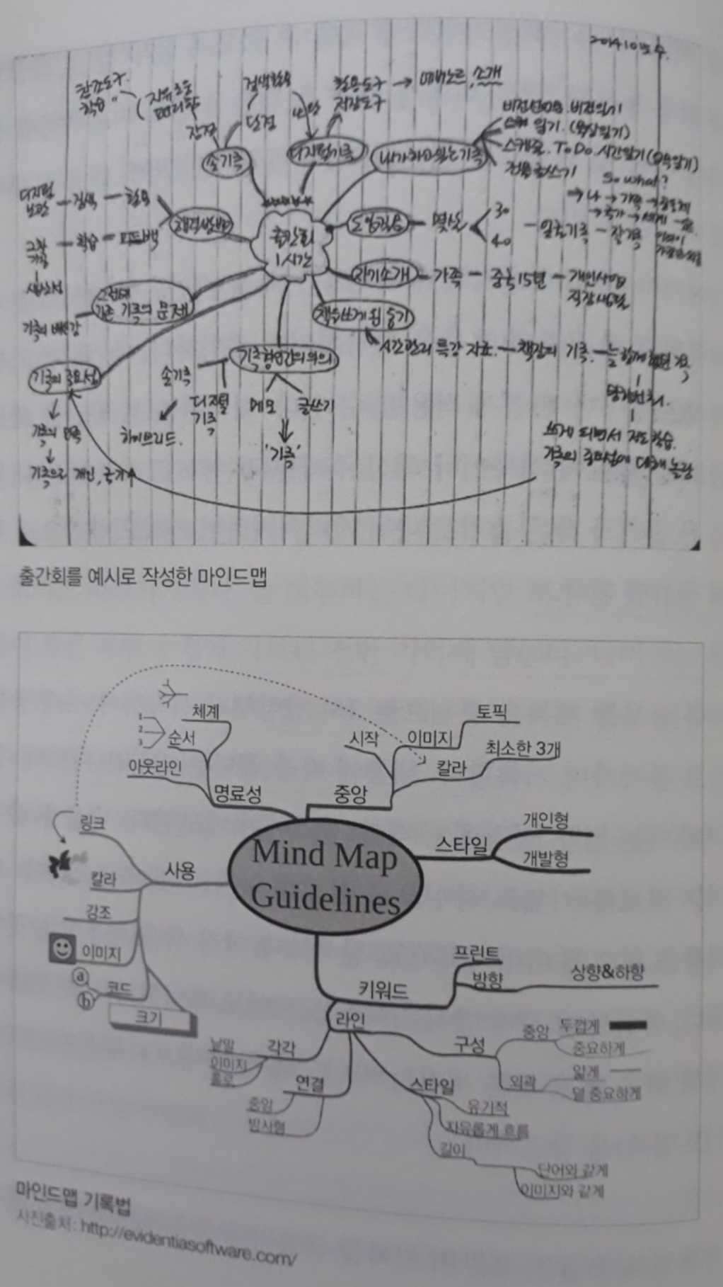 나는 보통 제목을 중심으로 3시 방향부터 시작하여 시계 방향으로 돌아가며 기록한다. 내용에 따라 끝나는 방향은 다르다. 강의 후에는 남는 공간에 주제를 정리하여 메모한다. 내용을 많이 적는 것보다 키워드 중심으로 전개해 나가는 것이 중요하다. 또 내용을 될수록 이미지화하고, 단색보다 여러 색을 사용하는 것이 좋다. 마인드맵 정리 방식은 독서 노트에도 유익하다. 마인드맵에 대해 더욱 알고 싶은 독자는 마인드맵 창시자 토니부잔이 쓴 <마인드맵북>을 참고하라.