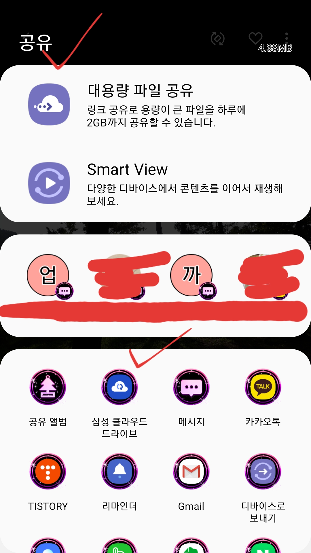 4단계. 대용량 파일 공유 클릭. (대용량 파일 공유하기와 삼성 클라우드 드라이브에 저장하는 두 가지 방법 중 공유하기를 먼저 해보겠습니다.)