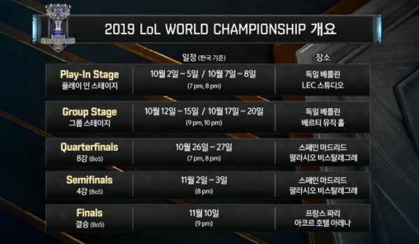 롤드컵 월드 챔피언십의 대회 일정은 2019.10.2.~11.10.입니다.