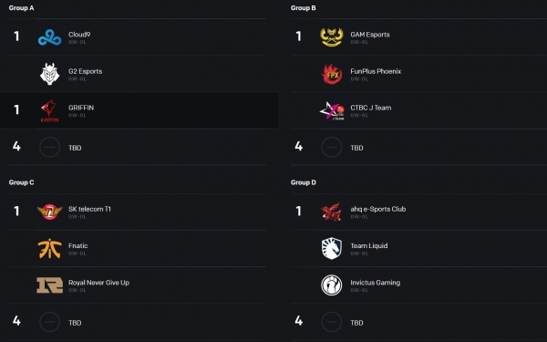 그리핀은 G2와 맞붙게 되었고, SKT는 프나틱 그리고 우지가 속해 있는 RNG와 같은 조인데요