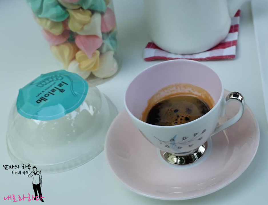 커피잔도 아주 고상, 우아(엘레강스)합니다. 크레마가 좀 아쉽네요. 향과 맛은 마카롱과 잘 어울립니다. 향도 괜찮았는데 제가 건드렸나요.;; 머랭 쿠키는 잘 아시는 그 느낌으로 사각사각 녹아들고, 마카롱은 생각보다 폭신폭신하니 아주 맛있습니다. 마카롱을 전면에 내세운 이유가 있군요.