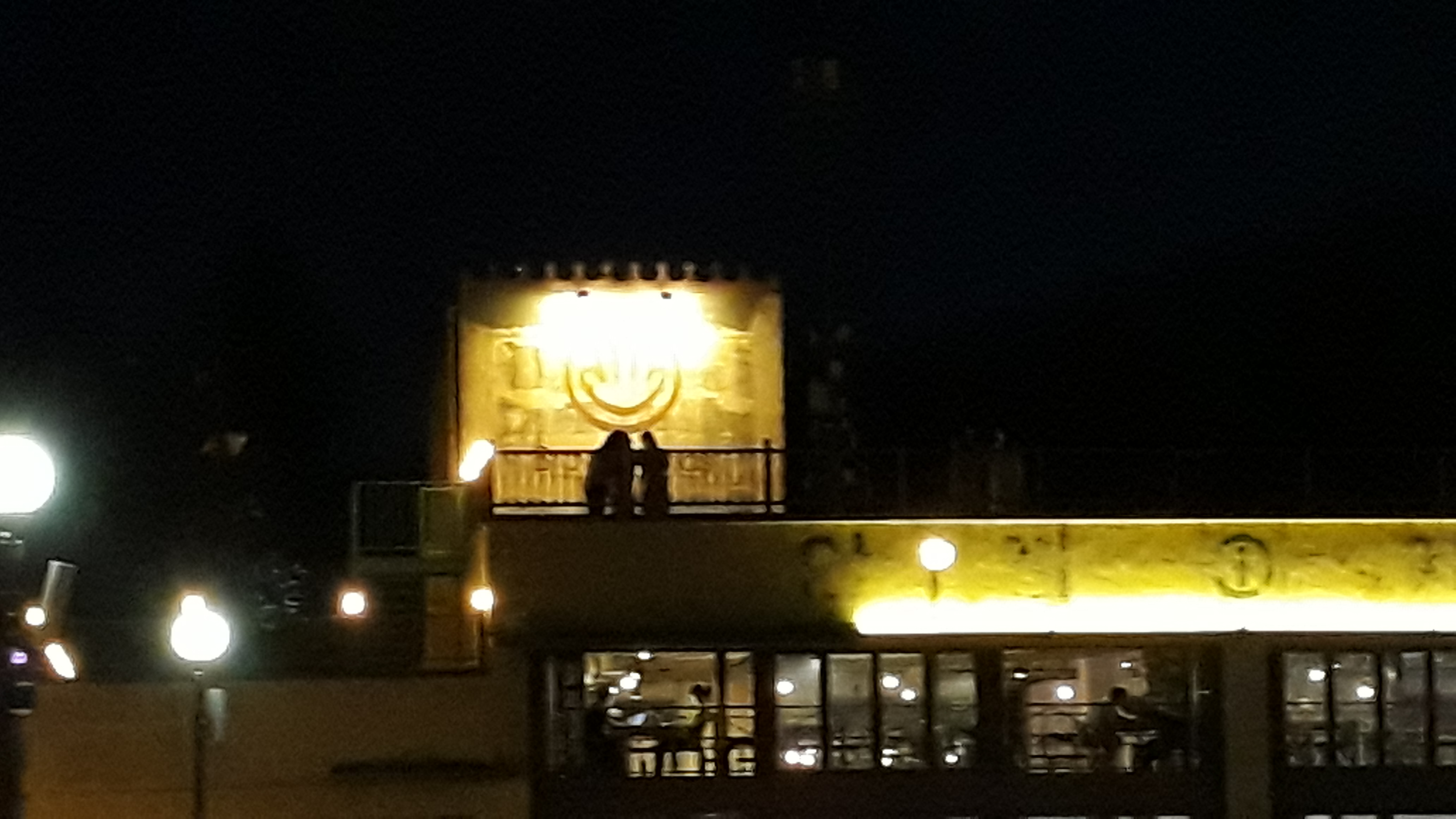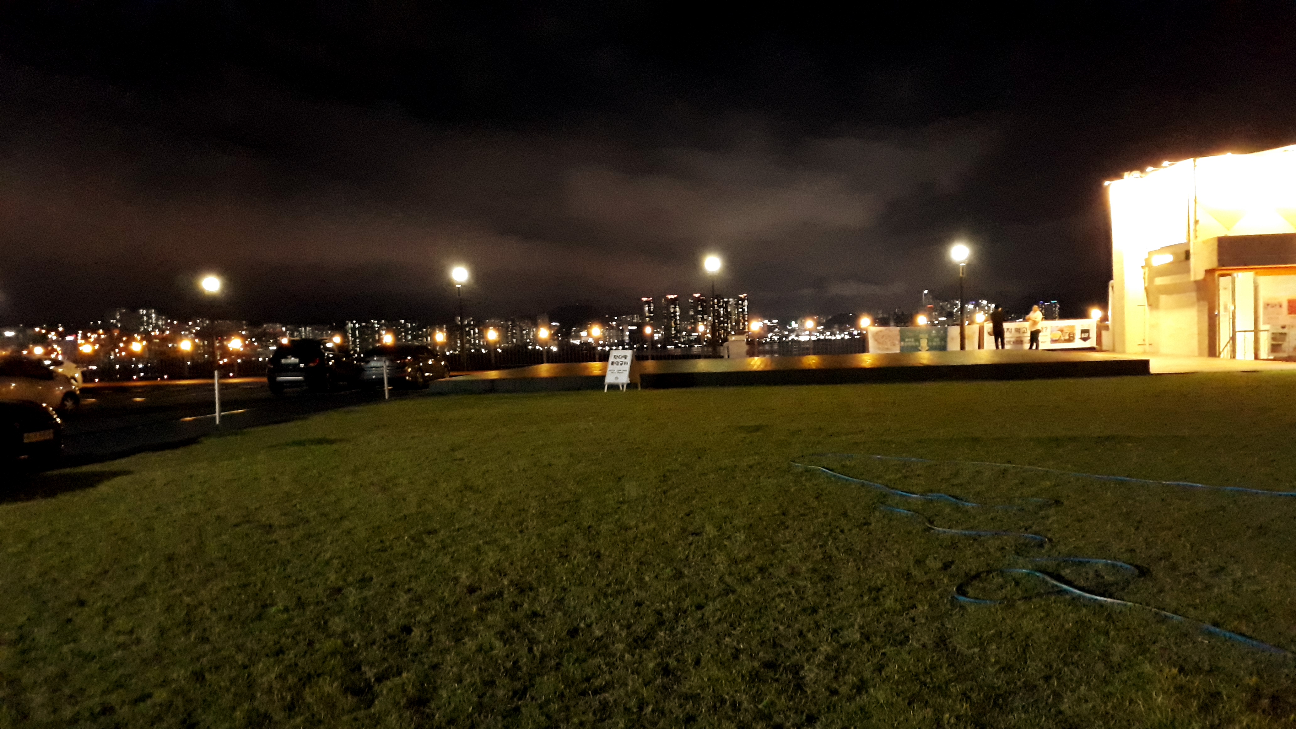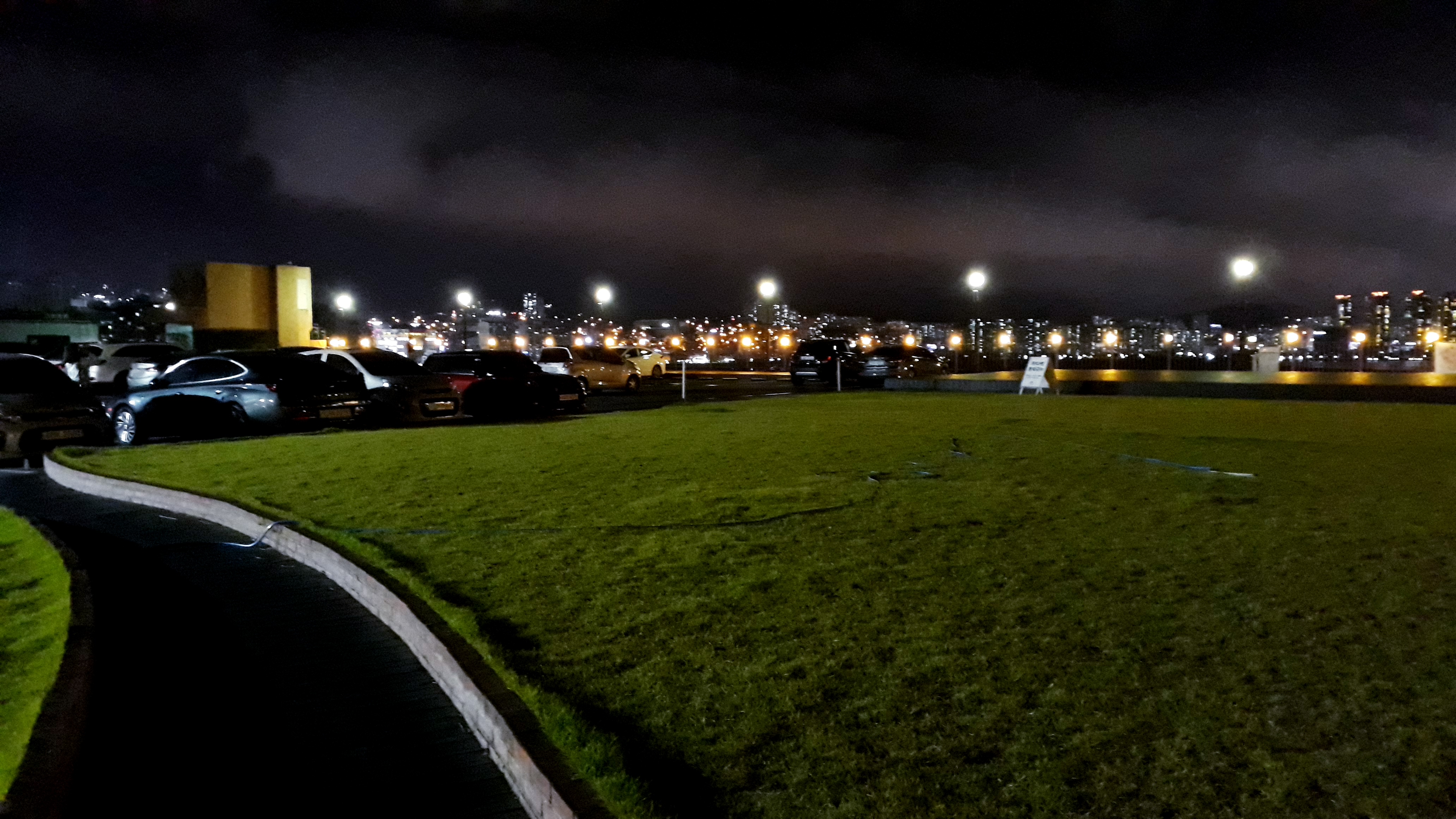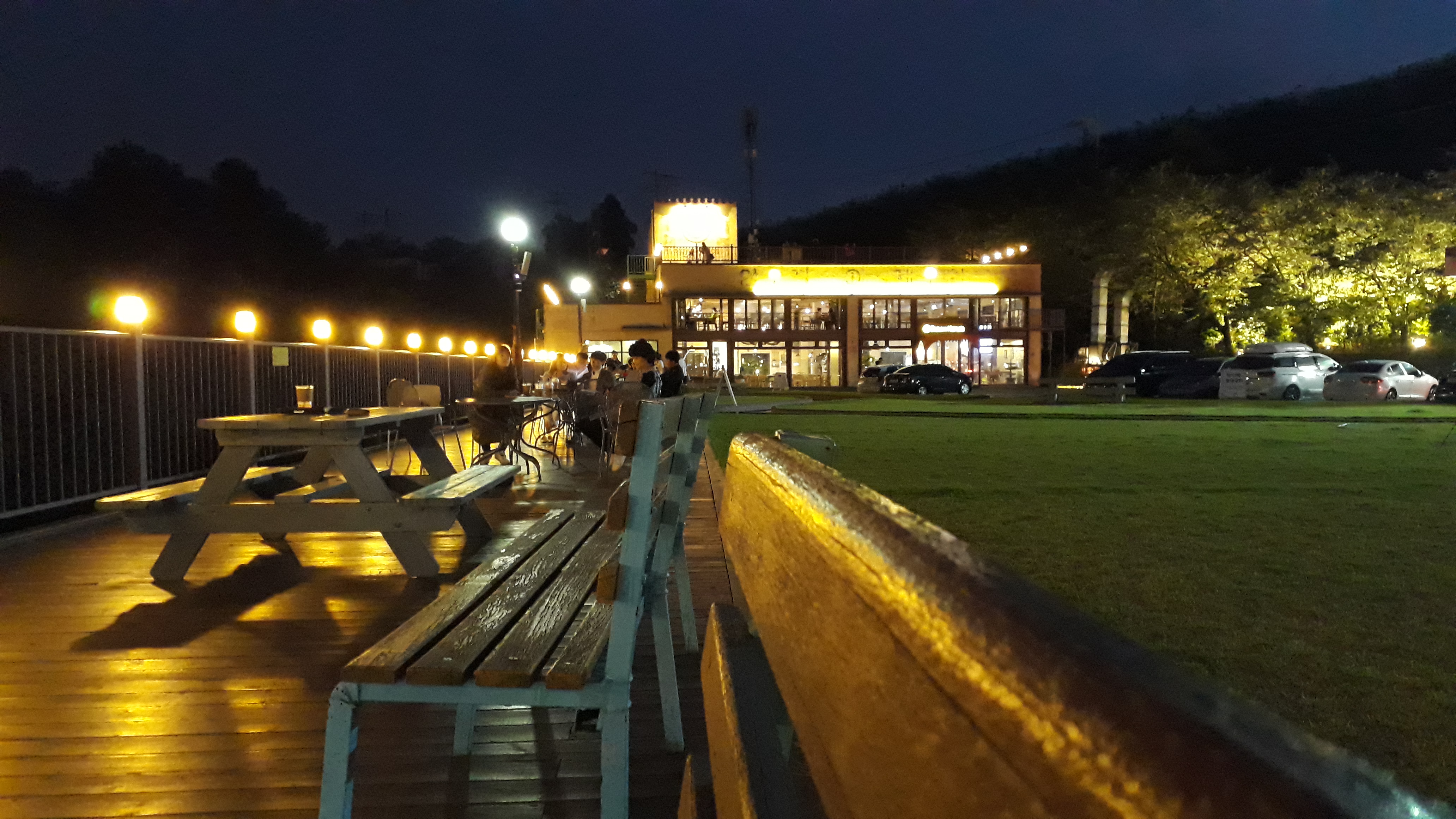 정면에 노란 불이 들어온 곳이 즉석(인스턴트) 라면을 파는 구내식당과 수제 맥주와 피자를 파는 바, 미술 전시관으로 가는 입구입니다. 화장실도 저곳에 위치하고 있습니다. 밤인데도 차량들이 제법 들어와 있네요.