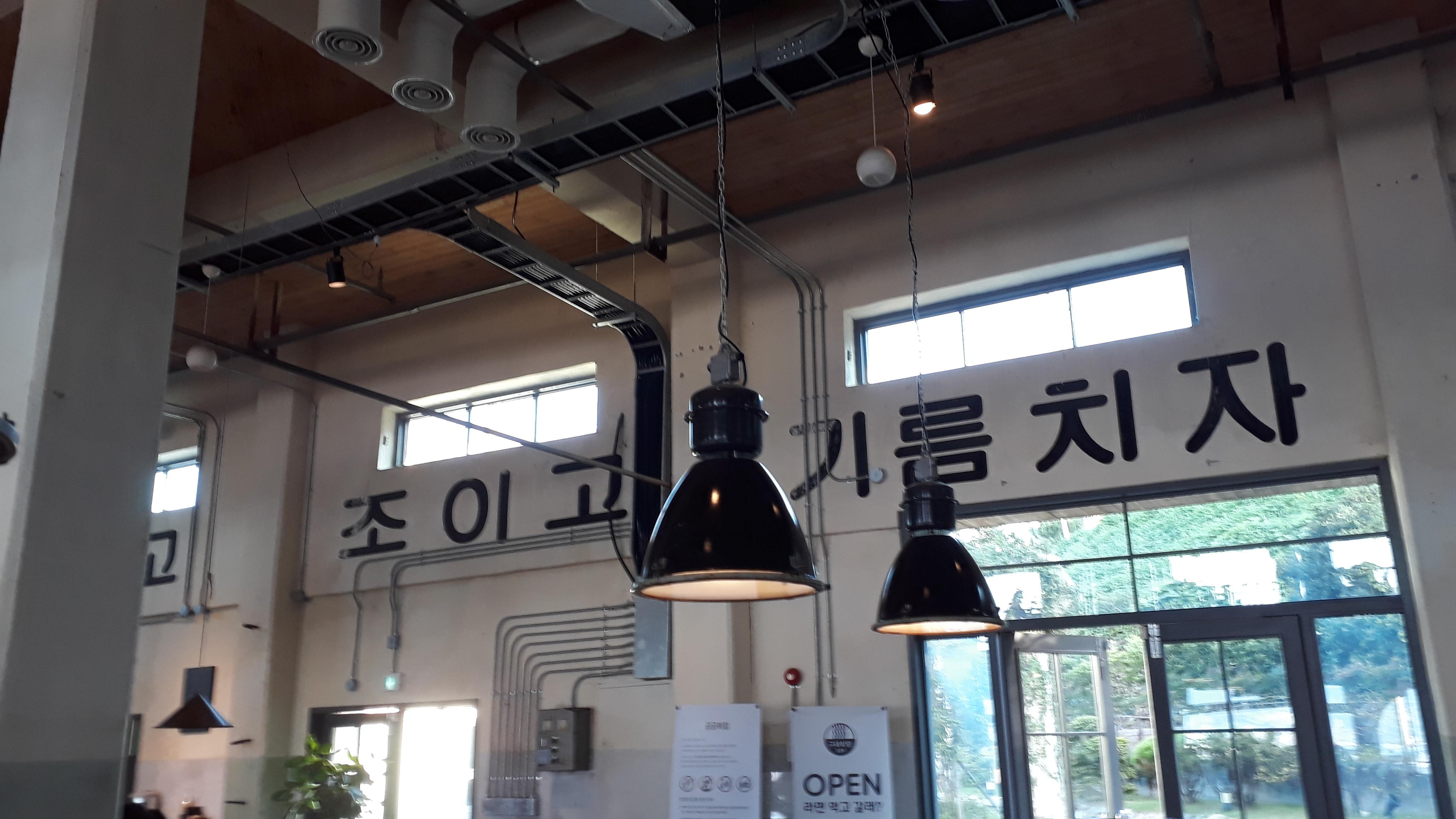 지하 1층은 미술 전시관과 수제 맥주바가 있으며 한 칸 더 내려오시면 구내식당을 만나실 수 있습니다. 커피숍도 경치가 좋지만 전 여기가 더 맘에 들더군요. ㅎㅎ 절대 맥주나 라면 때문이 아닙니다.; 저기 끝에 보이는 슈퍼마켓으로 가시면 다양한 간식들을 만나실 수 있습니다. 맥주와 마른 안주, 과자류, 라면, 떡볶이, 김밥이 있습니다. 프리미엄(부르주아) 강아지 간식도 있더군요. 저흰 프롤레타리아 고양이만 있어서 ㅜㅜ~