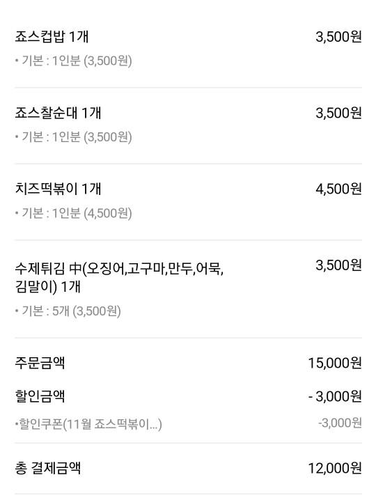 제가 주문한 메뉴는 죠스 컵밥 죠스 찰순대 치즈떡볶이 수제 튀김 중 세트 다해서 15000원인데 할인쿠폰 3천 원 적용으로 12000원 !!