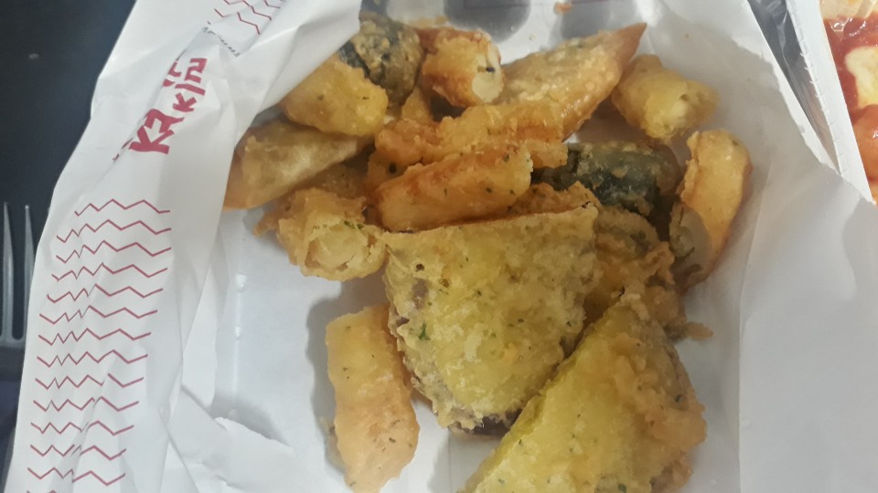 얼핏 보기에 오징어튀김 고구마튀김 그리고 김말이 튀김 이렇게 있어 보입니다