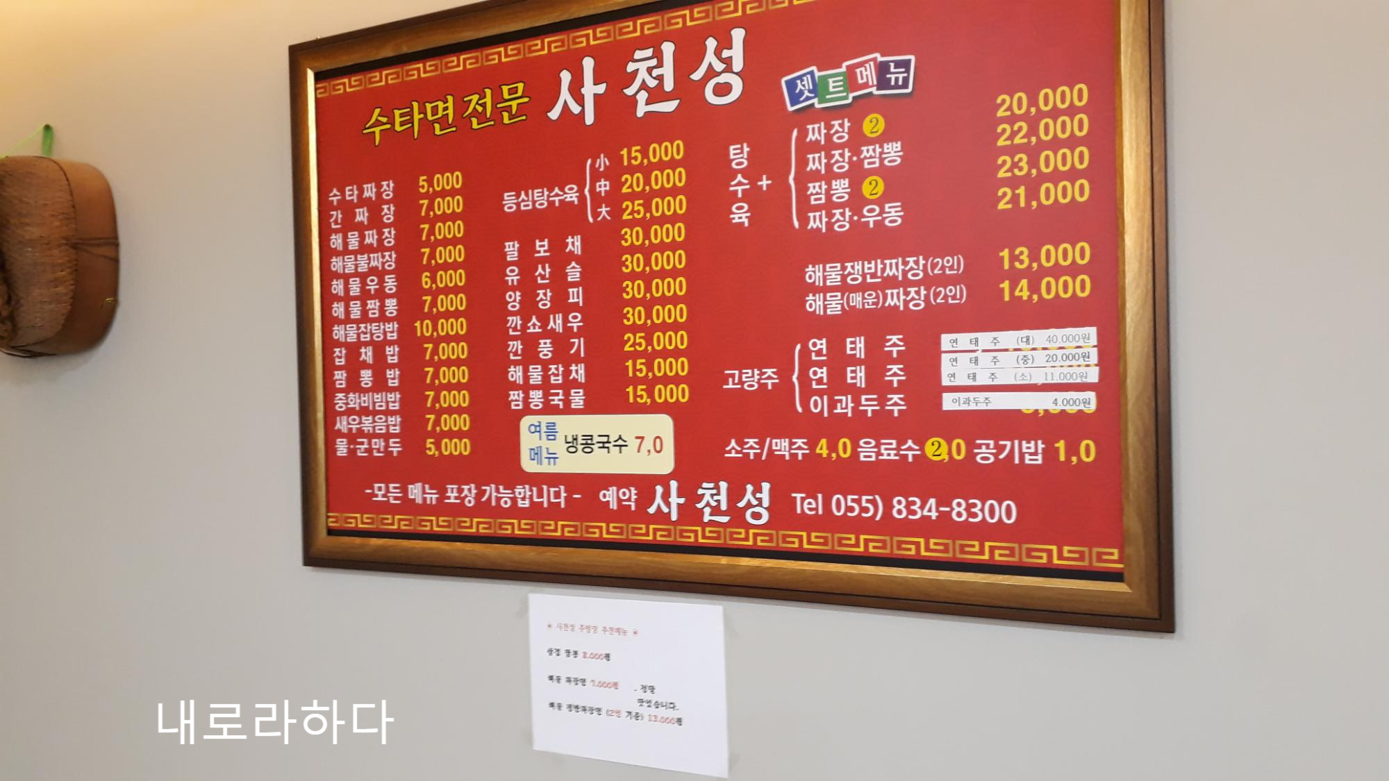 수타 짜장이 5천 원, 해물 짜장이 7천 원, 짬뽕이 7천 원이네요. 인기 여행지 치고는 준수한 가격 같습니다. 탕수육 세트메뉴도 2만 원이면 나쁘진 않네요.