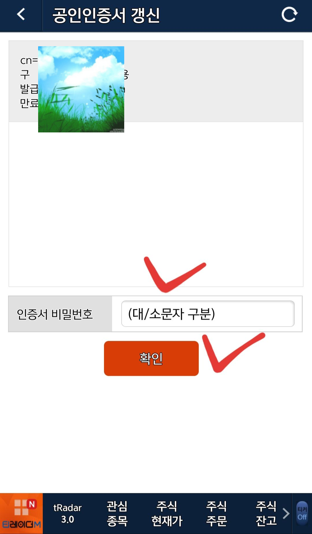 모바일로 공인인증서 갱신하는 방법입니다. (해당 사진은 아래에 있습니다.)