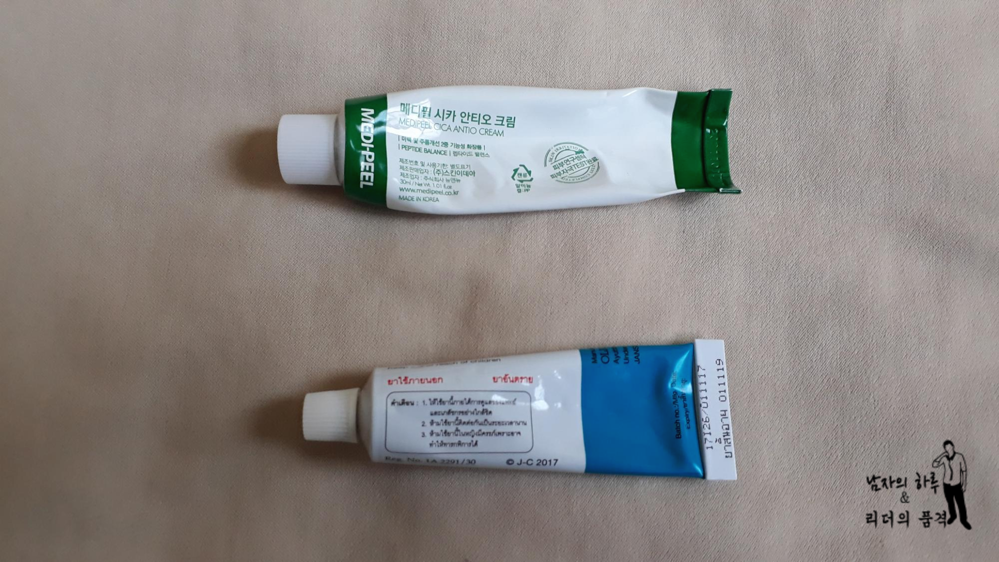 위에는 메디필 시카 안티오 크림이고 아래는 레틴 에이 크림입니다. 파란색이죠. 트레티노인이 0.025가 든 회색도 있습니다. 성분이 강한만큼 회색부터 사용하셔야 겠습니다.
