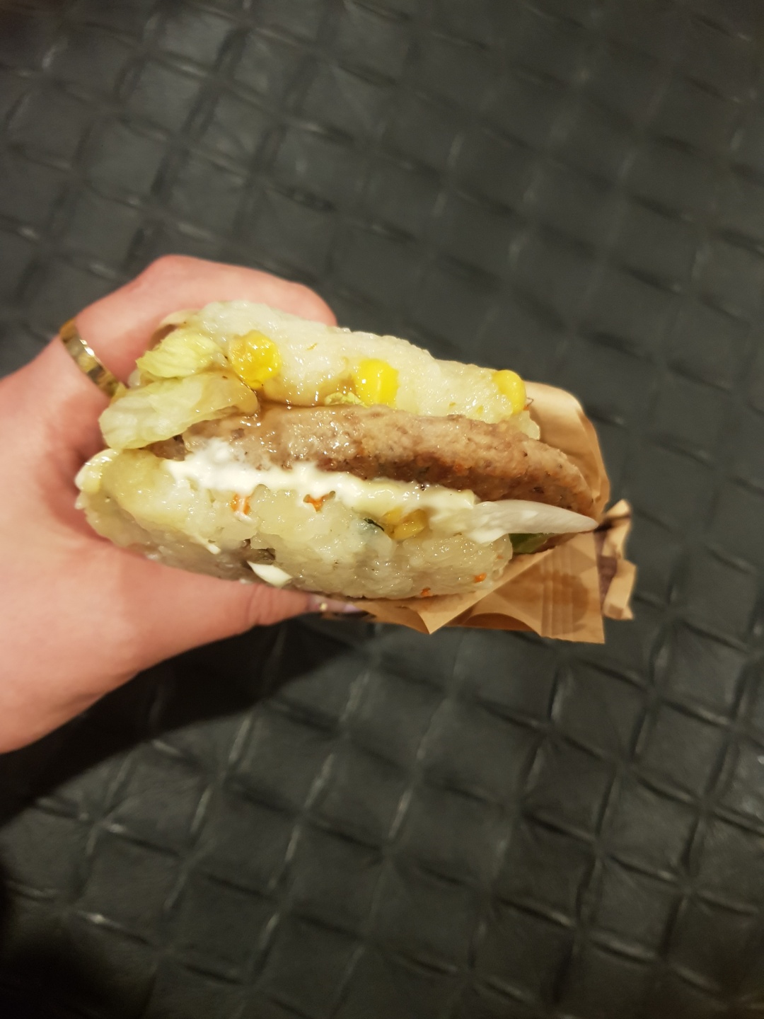 이런 느낌이에요 불고기 패티가 더 큽니다 제가 주문한 라이스불고기버거는요