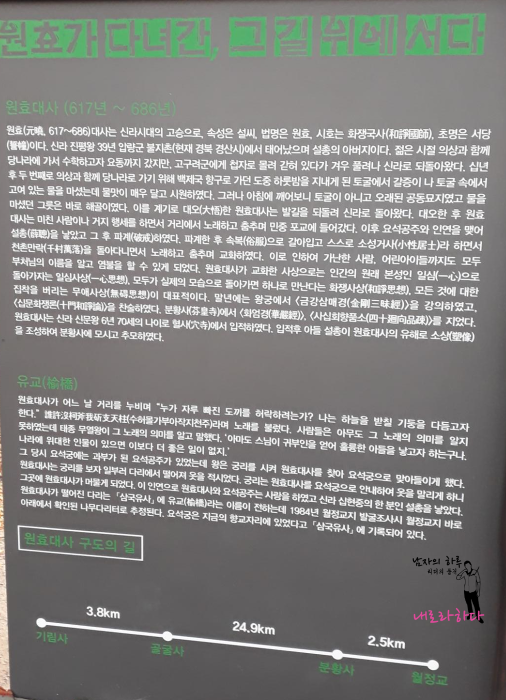 원효대사가 떨어진 다리는 <삼국유사>에 유교라는 이름이 전하는데 1984년 월정교지 발굴조사시 월정교지 바로 아래에서 확인된 나무다리터로 추정된다 합니다. 요석궁은 지금의 향교자리에 있었다고 <삼국유사>에 기록되어 있습니다. 향교는 5분 정도 거리에 있습니다.