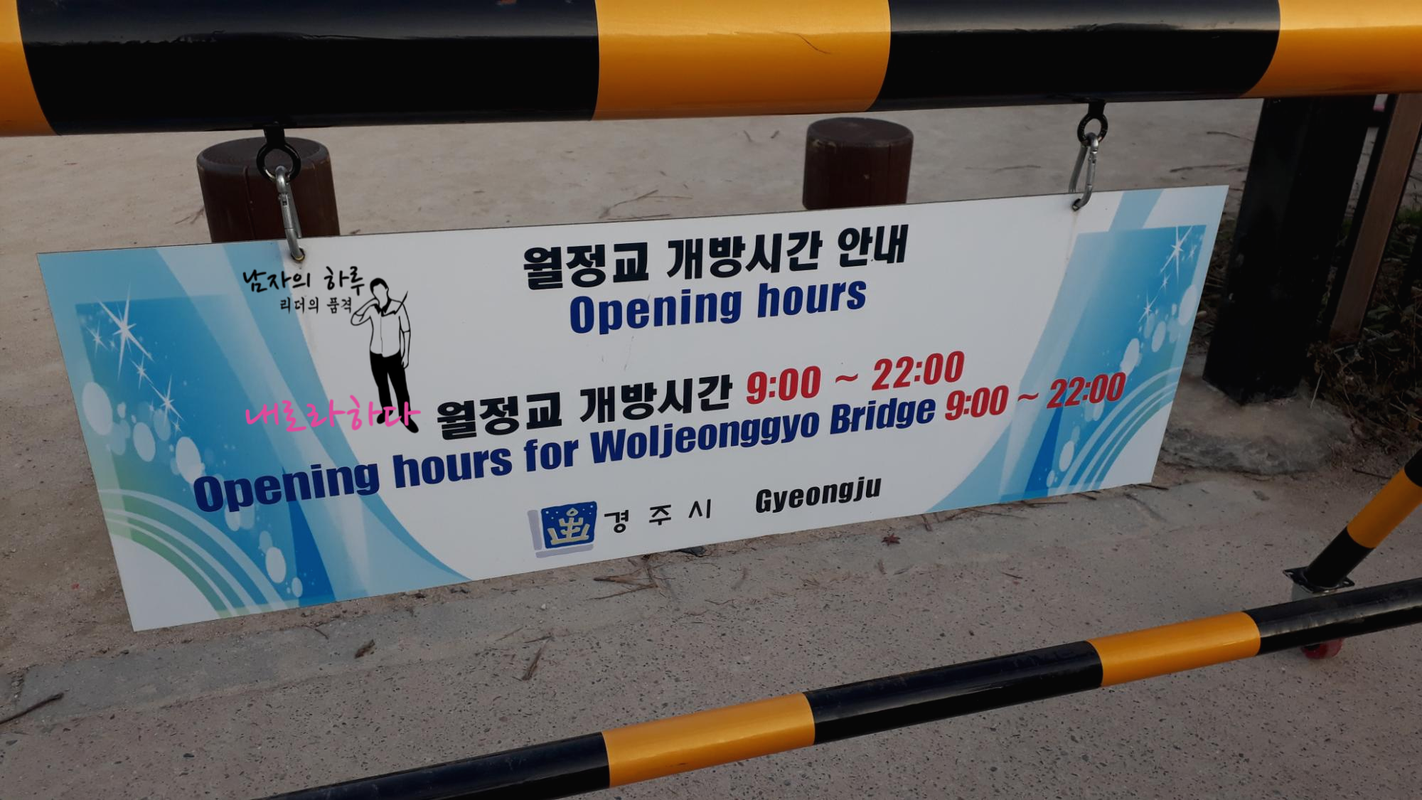 월정교 개방시간은 9:00 ~ 22:00 입니다. 야간 시티 투어 중 동궁과 월지는 9:30인가 입장 완료니까 거길 먼저 가셔야겠네요. 월정교는 교촌 마을에 있습니다. '교촌마을'의 먹거리는 교리김밥과 한정식, 피자집, 커피숍, 라면가게, 슈퍼 등이 있습니다. '동궁과 월지' 의 먹거리는 푸드 트럭(아메리칸 핫도그, 스테이크, 씨앗호떡, 튀김)과 길거리 어묵 등의 간단한 먹거리가 있습니다. 주자 만차일 시에는 인근에 황궁사지 주차장인가 거기 주차하시면 됩니다. 가까운 곳에 주차했을 시 어른 걸음으로 5분 거리네요.