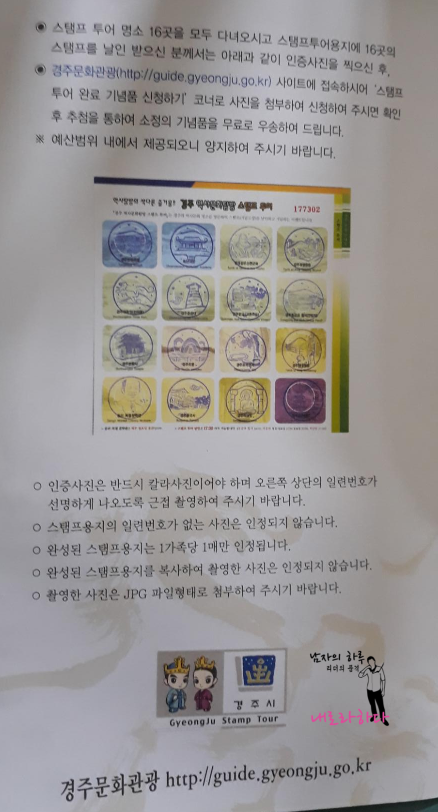 위처럼 도장을 다 찍고난 뒤에 경주문화관광 사이트에가셔서 `스탬프 투어 완료 기념품 신청하기`를 하시면 예산 내에서 추첨을 하여 기념품을 준다고 합니다. 쉽진 않겠군요. ㅎ 그래서 전 그냥 이거 기념으로 가지고 다니다가 다음에 또 들르면 찍어서 혼자 기념해보려고 합니다. 언제 다 완료할진 모르겠지만... 다른 여행지에도 이런 게 있던데 믿을만한 대표 여행지들이라 그런지 알차게 구경하기 좋습니다.