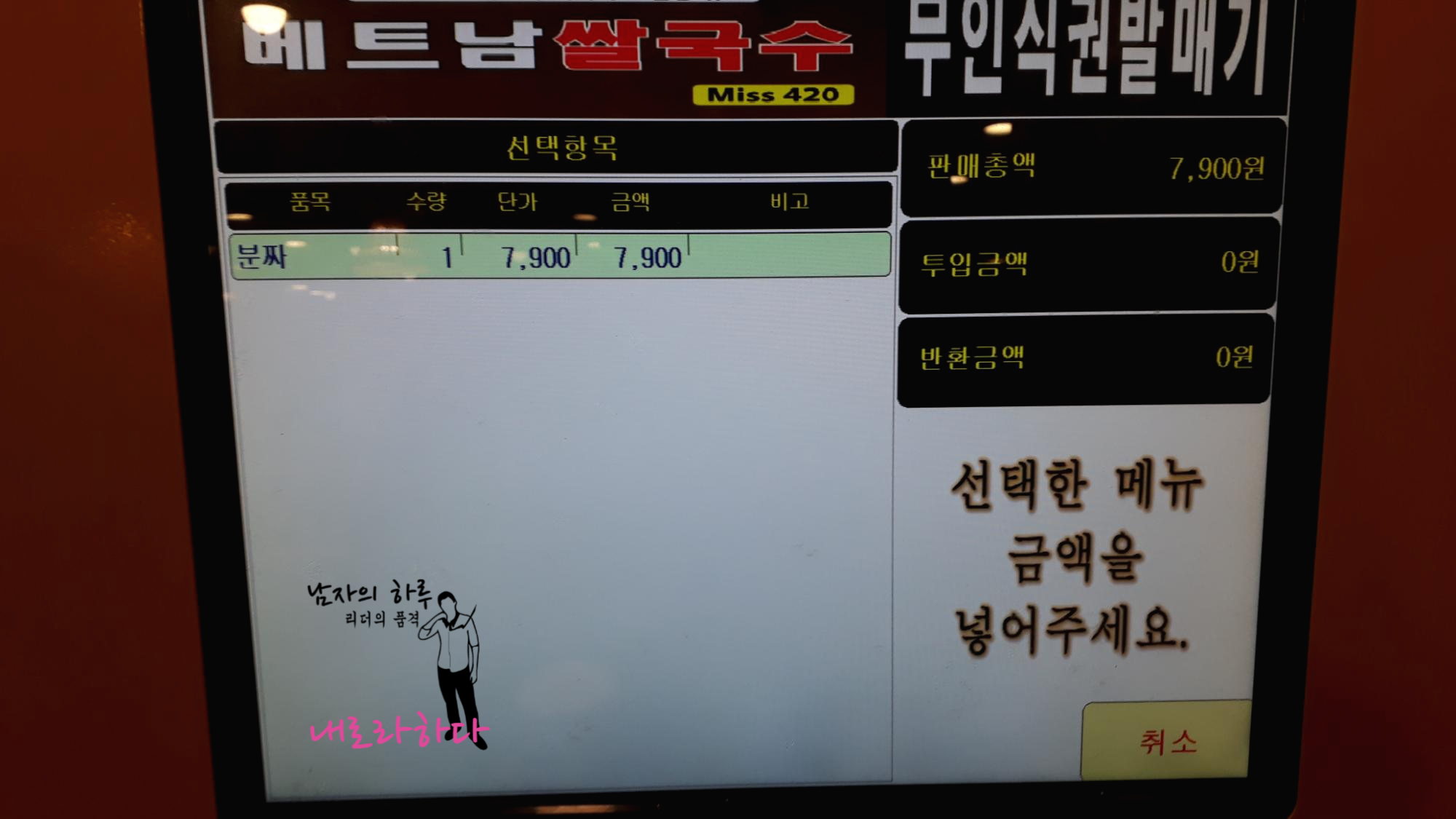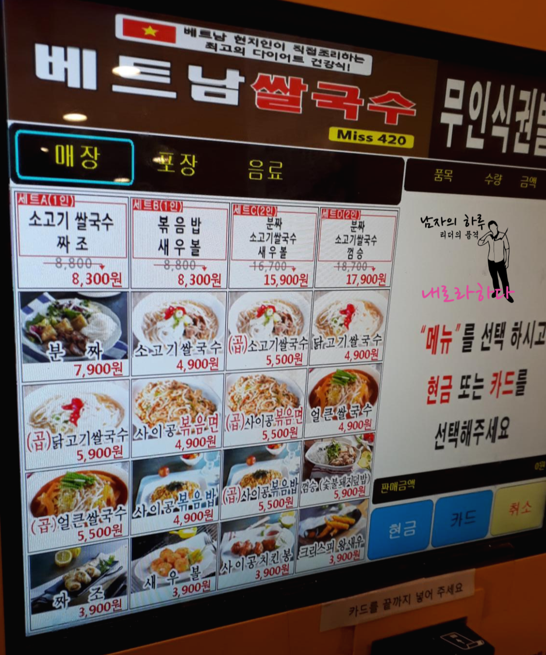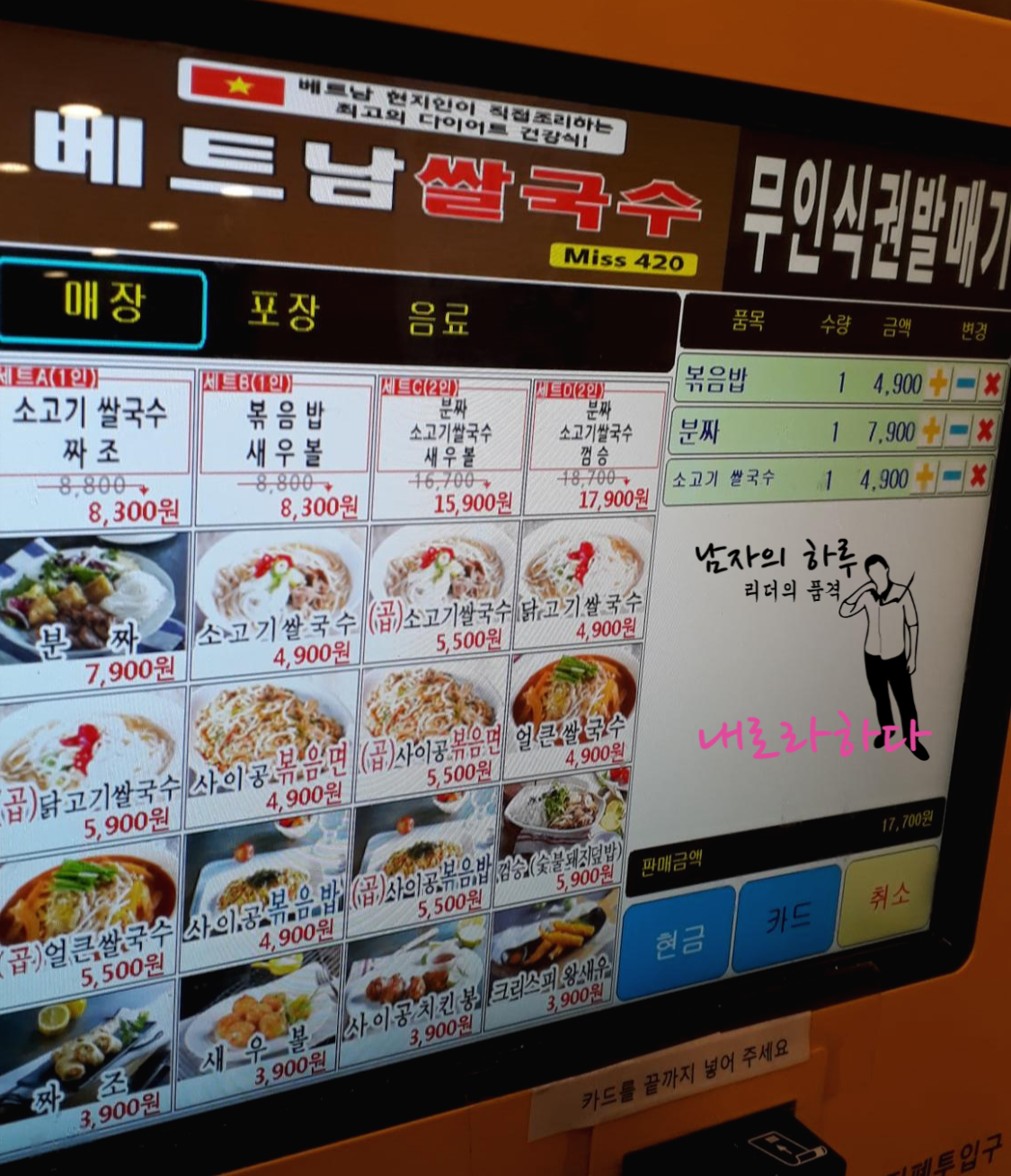 잠시 다른 메뉴를 구경하며 침 흘리다 우측 하단에 카드를 누르고 기계 하단에 카드를 넣으면 완료됩니다. 카드 잘 챙기시구요.^^