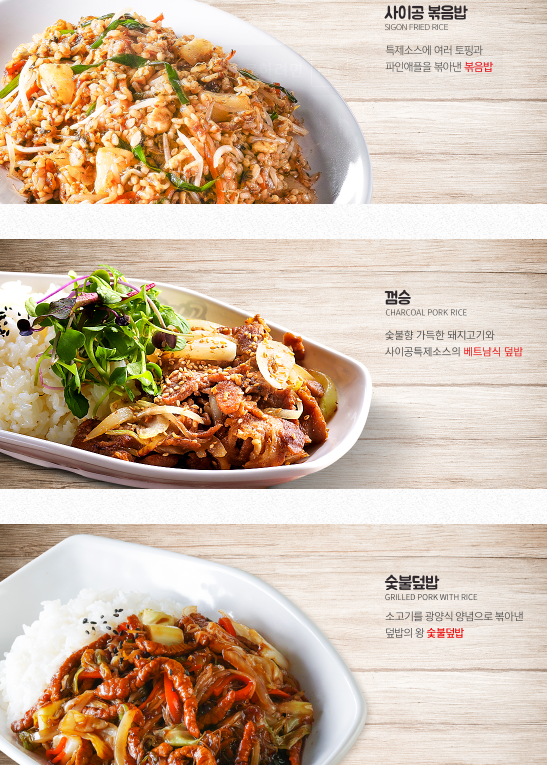 '미스사이공 세트 메뉴'가 보이는데 1인용에는 분짜가 없어서 패스합니다. 2인 용에는 밥이 없어서 패스. 3인용은 분짜랑 껌승 숯불돼지덮밥 맛이 겹칩니다. 어쩔수 없이 당연히 먹어야 되는 쌀국수와 분짜를 고르고 맛이 다른 볶음밥을 시킵니다.