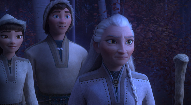 2편에서 엘사는 바다를 건너기 위해 치마를 벗는데 속에 바지를 입고 있습니다. 여성성을 대변했던 치마대신 바지를 보여주는 행위는 그동안의 두려움과 나약함을 벗어던지면서 주도적으로 문제를 해결해 가겠다는 의미로 볼 수 있습니다. 하지만 옷을 벗어던지지는 못하고 바위 위에 가지런히 벗어두는 한계도 보여주고 있습니다.