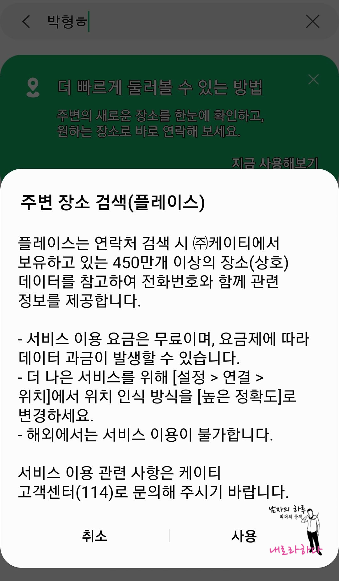 5. 450만개 이상의 장소 데이터를 참고하여 전화번호와 함께 관련 정보를 제공합니다. 서비스 이용 요금은 무료이며, 요금제에 따라 데이터 과금이 발생할 수 있습니다. 더 나은 서비스를 위해 [설정 > 연결 > 위치]에서 위치 인식 방식을 [높은 정확도]로 변경하면 됩니다. 해외에서는 이용이 불가합니다. 관련 문의는 케이티 고객센터 114로 문의하시기 바랍니다.