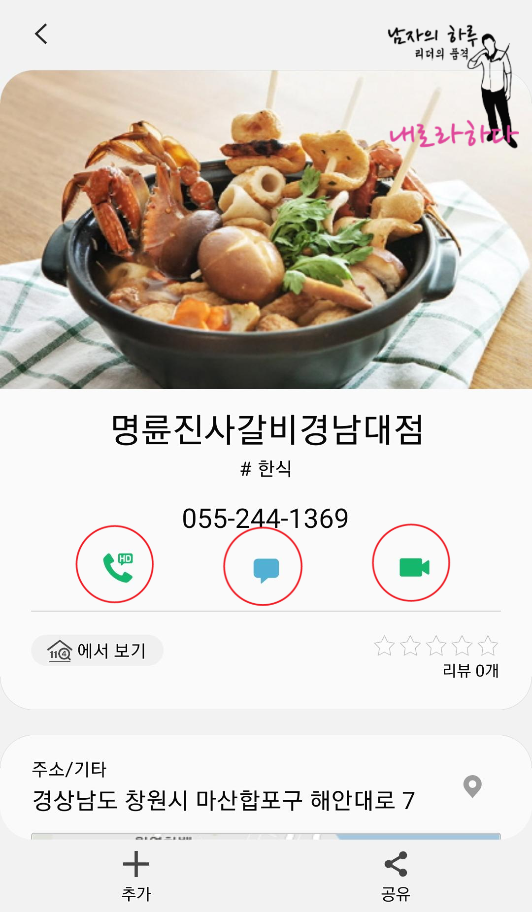11. 중앙에 전화, 문자, 영상통화가 있고, 밑에는 리뷰가 있습니다. 마치 구글 화면을 보는 느낌이네요. 맨 밑으로 내려오면 장소를 추가해놓을 수도 있고 공유할 수도 있습니다. 뭐 전화해서 설명할 필요가 없겠군요.