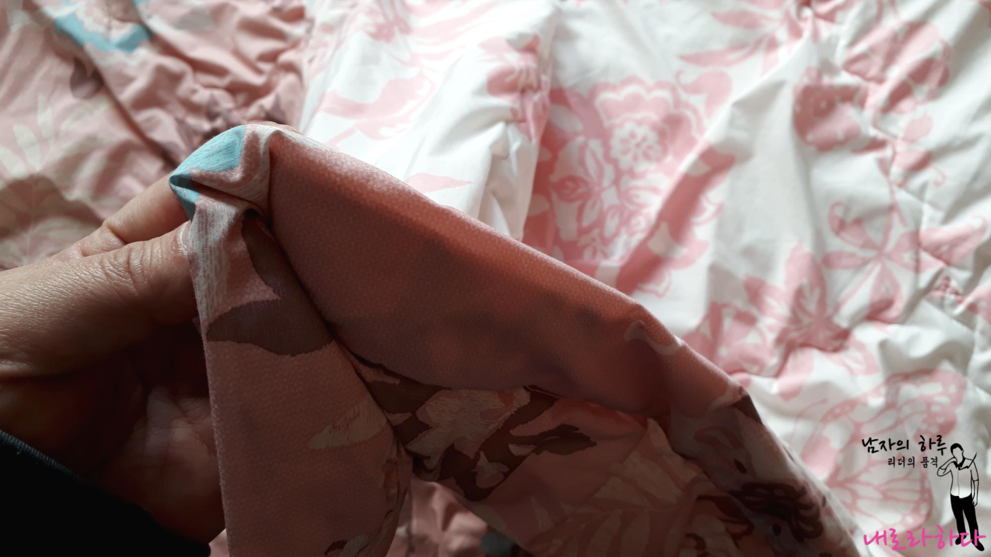 위에 이불을 완전히 들춰봤습니다. 바닥도 핑크 핑크 하네요. 여길 추천하는 이유 중 하나는 질리지 않는 고급스러운 디자인입니다. 디자이너 분들의 실력도 한몫하는 것 같아요. 다른 이불 하나는 회색이라 칙칙할 거라 생각했는데 멋진 디자인이 또 살려내 버리더군요. 매장에서 보는 거랑 집에서 보는 거랑은 또 다르더군요. 미리 펴 보시고 구입하세요. 오래 쓸 건데 꼼꼼하게 보셔야죠.
