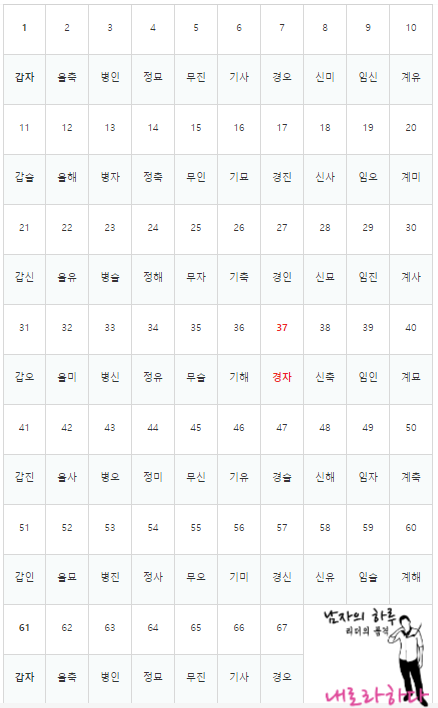 위의 천간 ‘갑을병정 무기경신 임계’중 1번인 ‘갑’과 십이지인 ‘자축인묘 진사오미 신유술해’중 1번인 ‘자’를 합해서 아래의 표와 같이 '갑자년'이 됩니다.