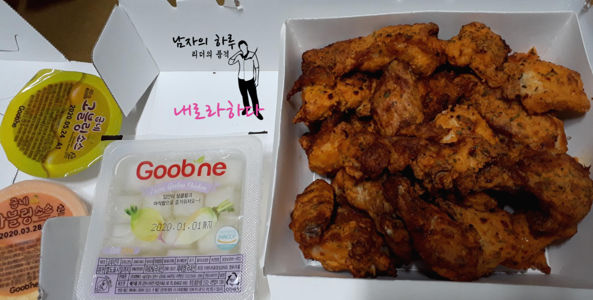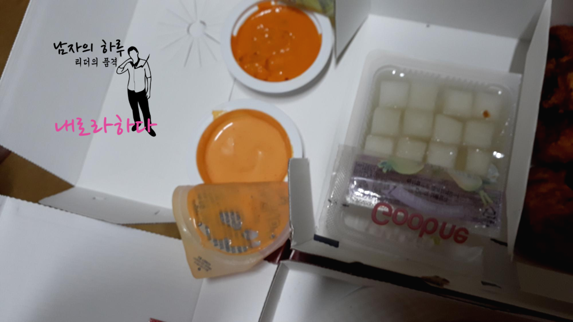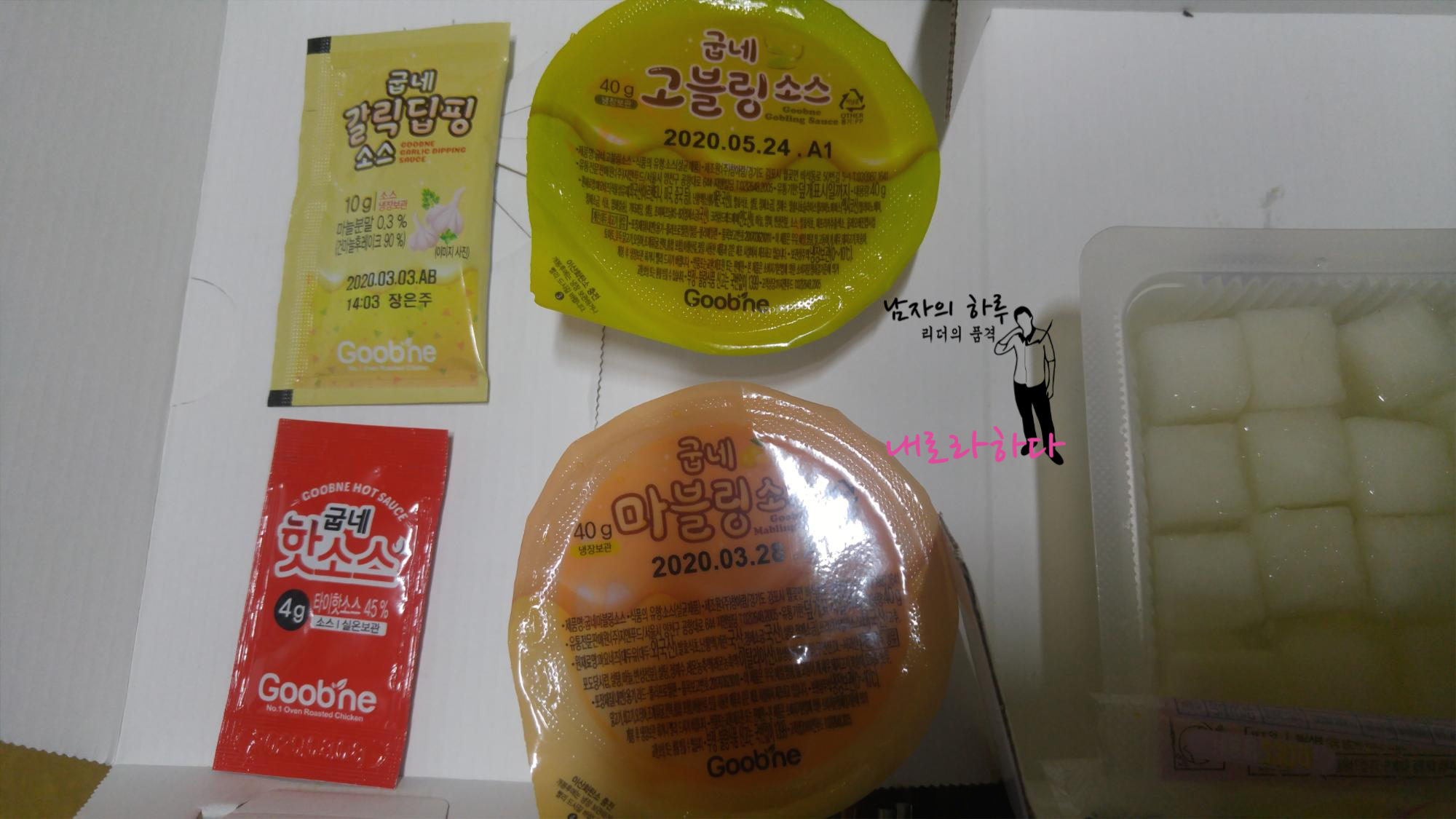 고추바사삭 치킨과 함께 할 고블링, 마블링 소스를 준비합니다. 고추 바사삭에 이게 섞이면 장난이 아니죠. 치킨무도 미리 개봉해 두고,