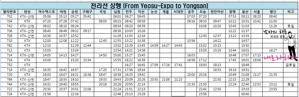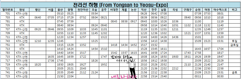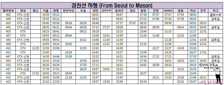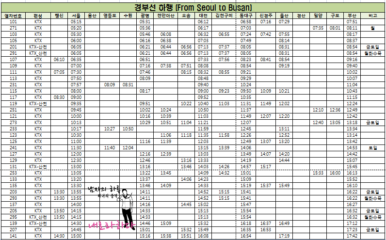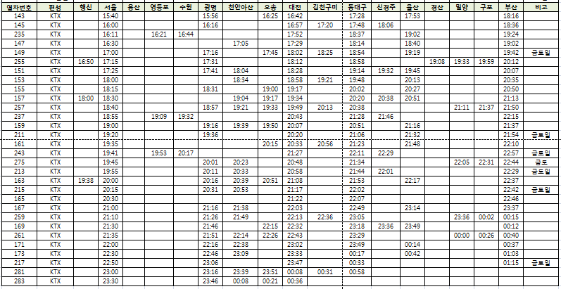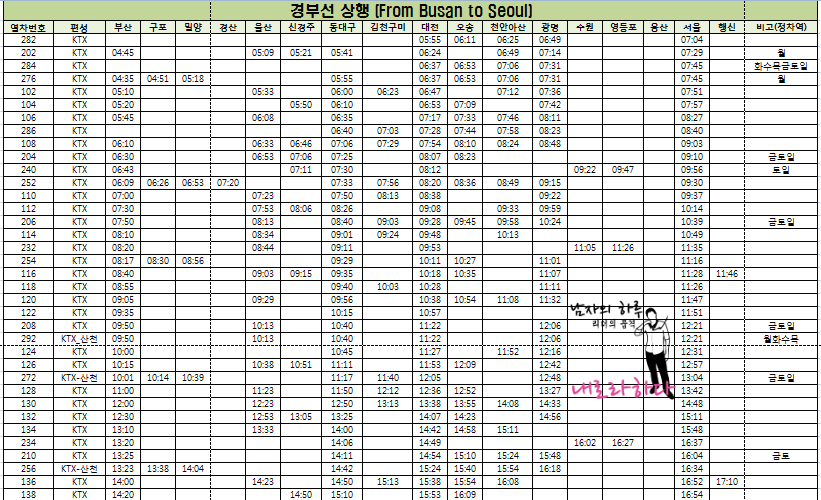 홈페이지에선 엑셀로 다운을 받으라고 해서 이렇게 바로 보실 수 있도록 올립니다. PC에선 엑셀이 없으면 못 보나요?ㄷㄷ (시간표는 맨 아래에 있습니다.) (1) KTX : 서울~(신경주)~부산 ※ 정차역 2개 이하 열차..