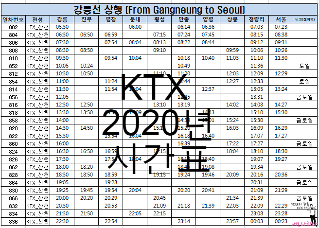 KTX 시간표 2020 전체 버전(2019. 12.30일 기준)입니다.