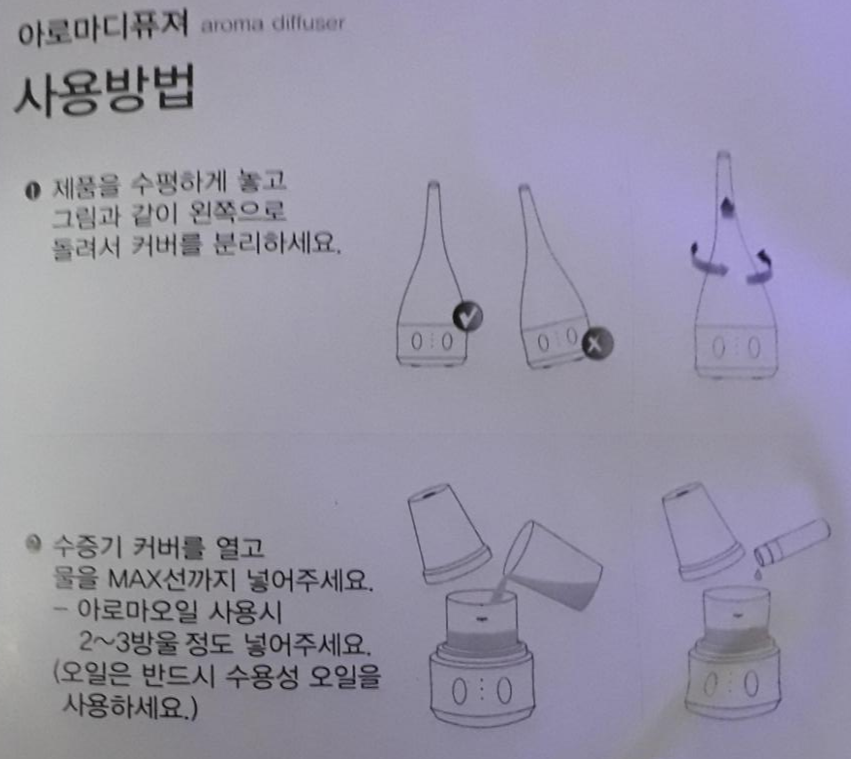 아로마 가습기는 아래처럼 위 뚜껑을 좌측으로 돌려서 뚜껑을 연 다음 내부 커버를 열어서 계량컵으로 물을 붓는 귀찮은 구조입니다. 2시간 마다 갈아 넣는다는 점에선 단점이겠습니다.