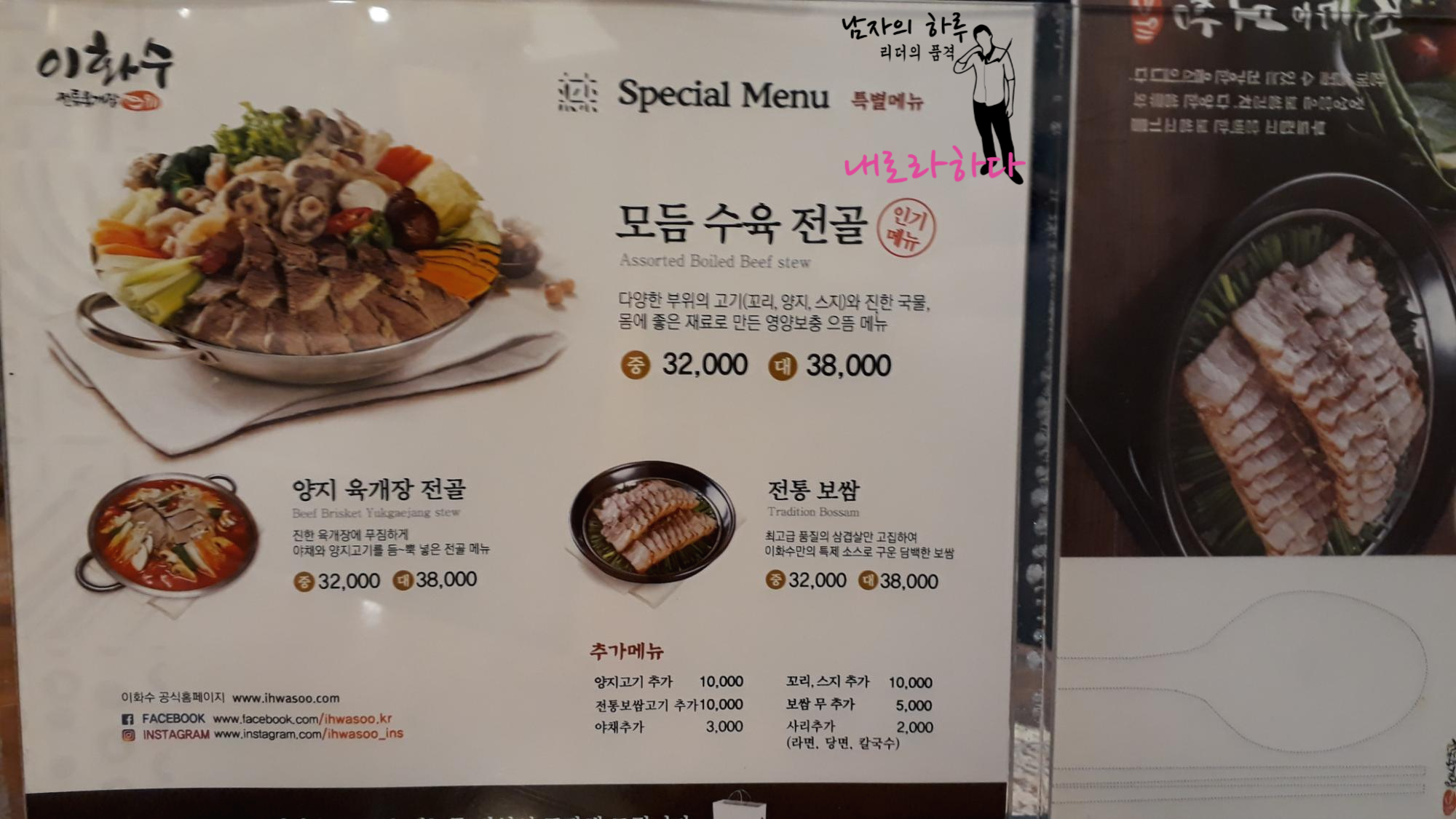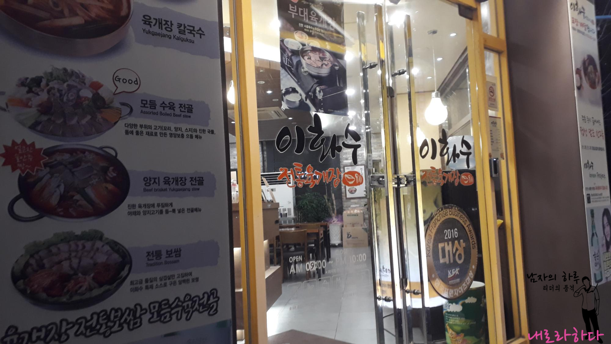 이화수 전통육개장 메뉴입니다. 오늘은 부대 육개장을 먹으러 왔습니다. 이화수 육개장이야 프랜차이즈로 잘 알려진 곳이니 맛은 검증된 곳이죠. 어릴적 어머님께서 해주시던 맛에 매콤한 자극이 더 가해진 맛입니다.