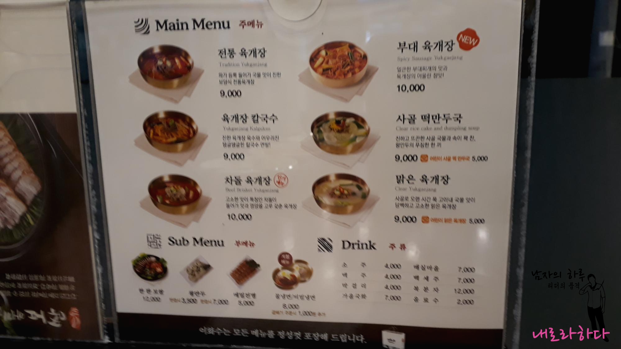 전통 육개장 9,000 / 차돌 육개장 10,000 / 맑은 육개장 9,000 / 부대 육개장 10,000 / 육개장 칼국수 9,000 / 사골 떡만두국 9,000