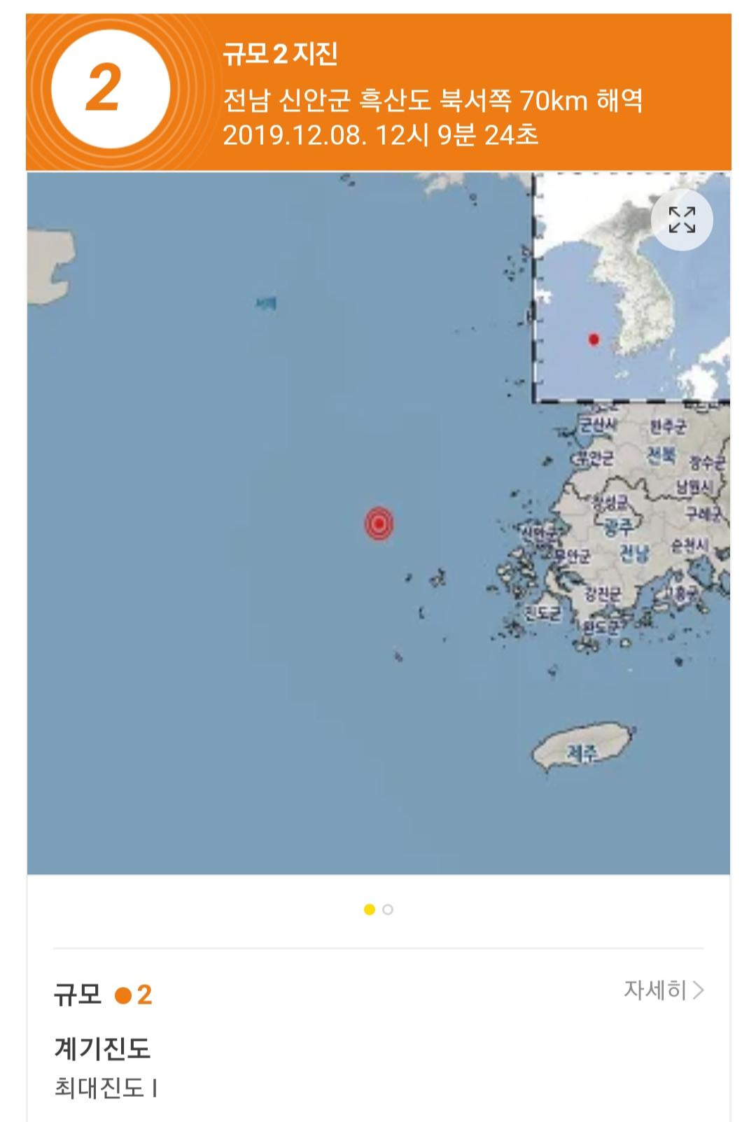 규모 2. 전남 신안군 흑산도 북서쪽 70km 해역, 2019.12.08. 12시 9분 24초