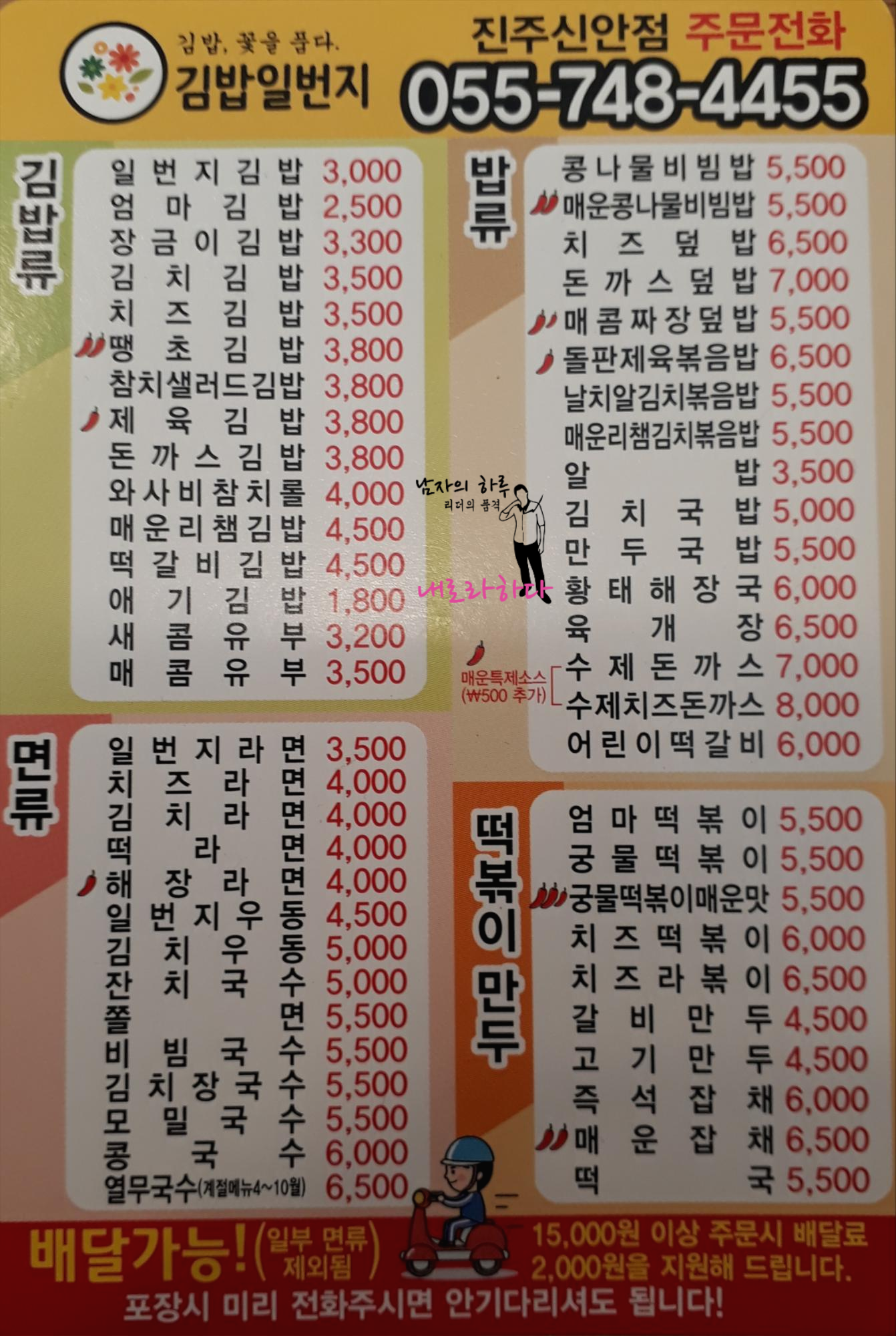 김밥일번지는 김밥도 그렇고 메뉴들이 거의 다 맛있습니다. 참고로 여기는 진주 신안점입니다. 일단 김밥일번지 메뉴들 부터 알아볼까요?