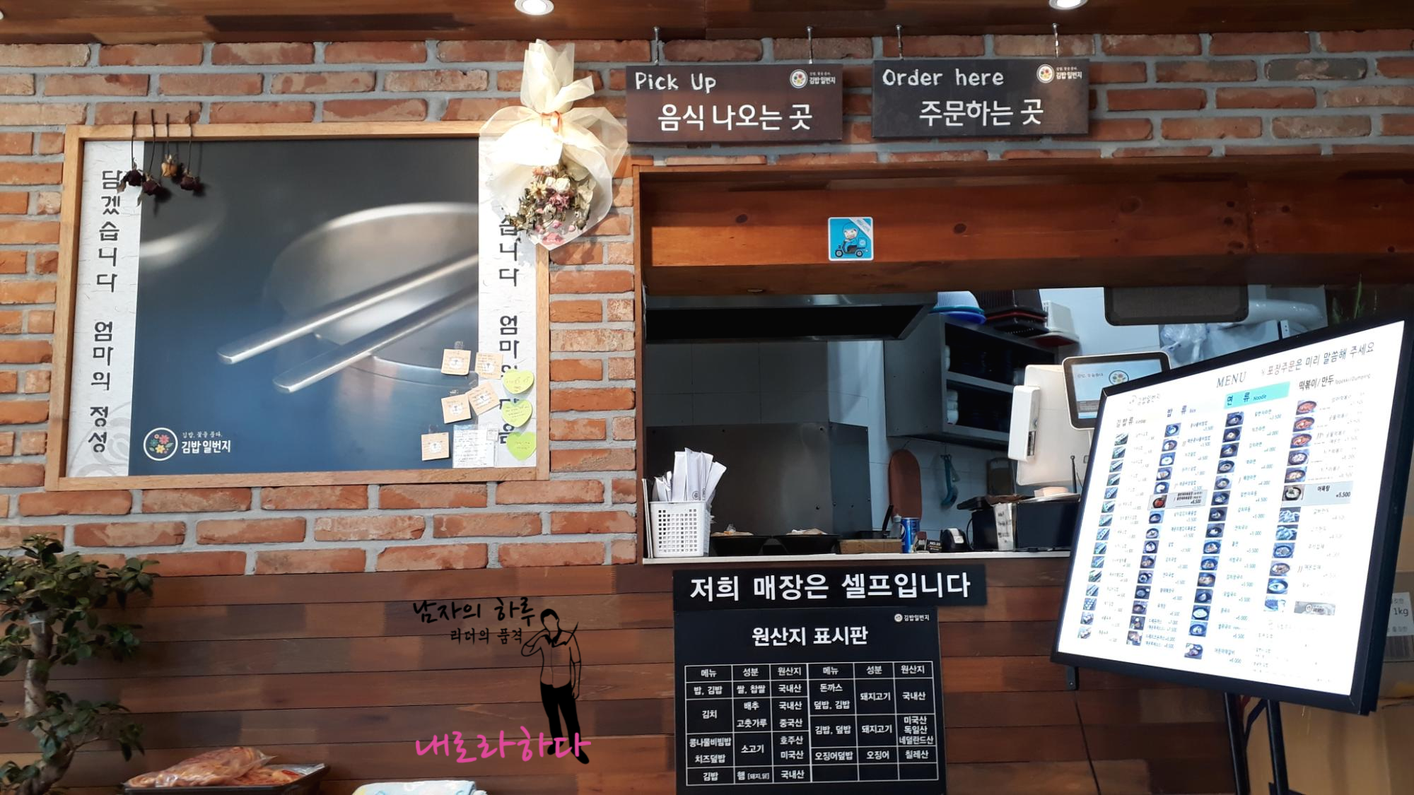 전국의 김밥일번지 매장들의 구조는 거의 비슷합니다. 아래의 사진처럼 주문하는 곳과 음식 나오는 곳 그리고 반납하는 곳이 있습니다.