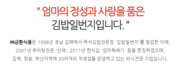 김밥일번지가 맛있는 이유는 바로 재료입니다. 대관령에서 온 황태, 덕유산 고냉지 배추, 해남의 청정배추, 소백산의 자연친화적 청정쌀, 전북 무안 무형문화재 효산스님의 죽염 된장, 남해 완도김. 바로 이런 좋은 재료들이 있기에 어디서나 차별화된 맛을 낼 수 있었던 것입니다. 이제 좀 알겠군요.