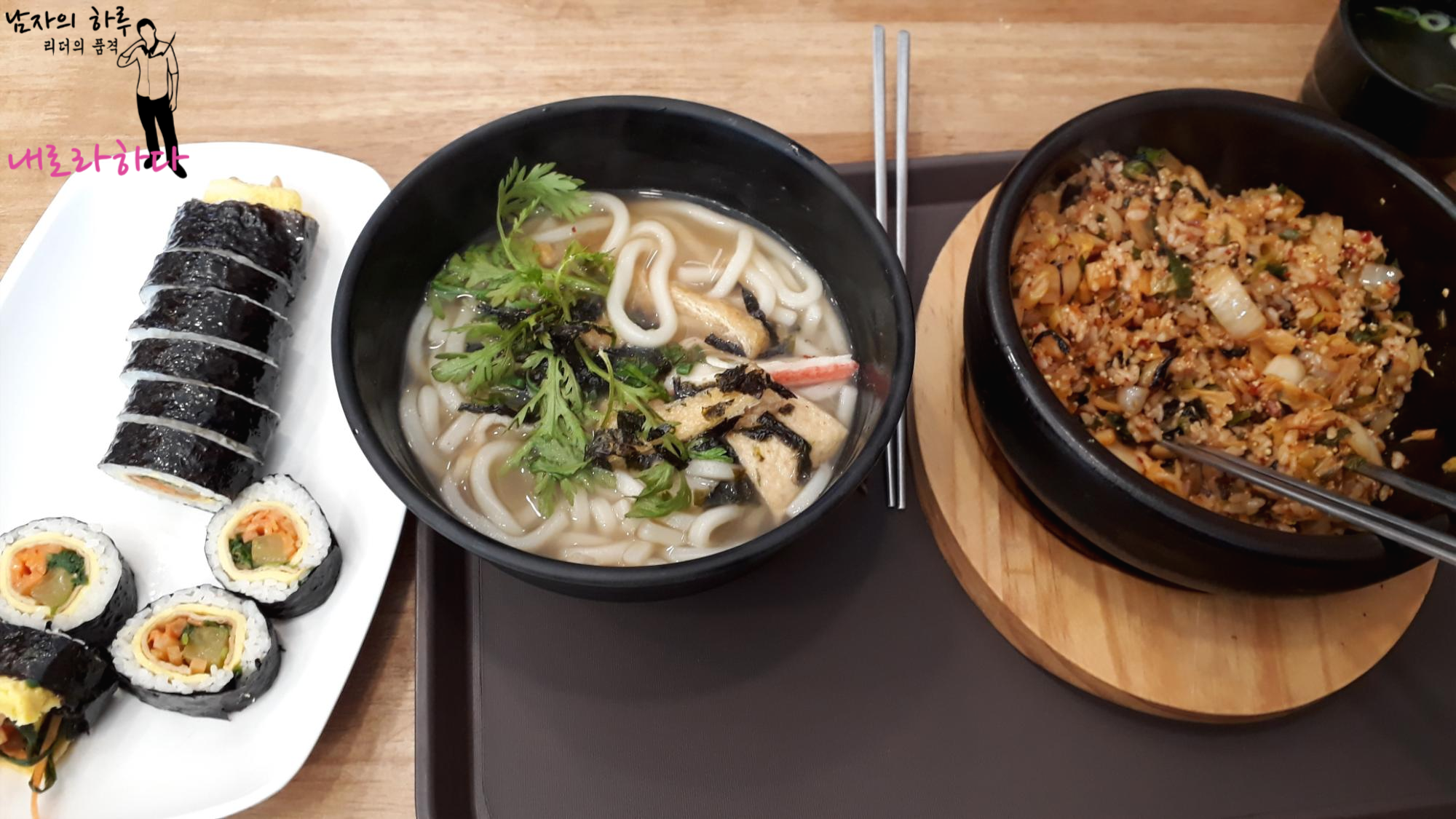 오늘 주문한 메뉴인 일번지 우동, 날치알 김치볶음밥, 엄마 김밥이 나왔습니다.