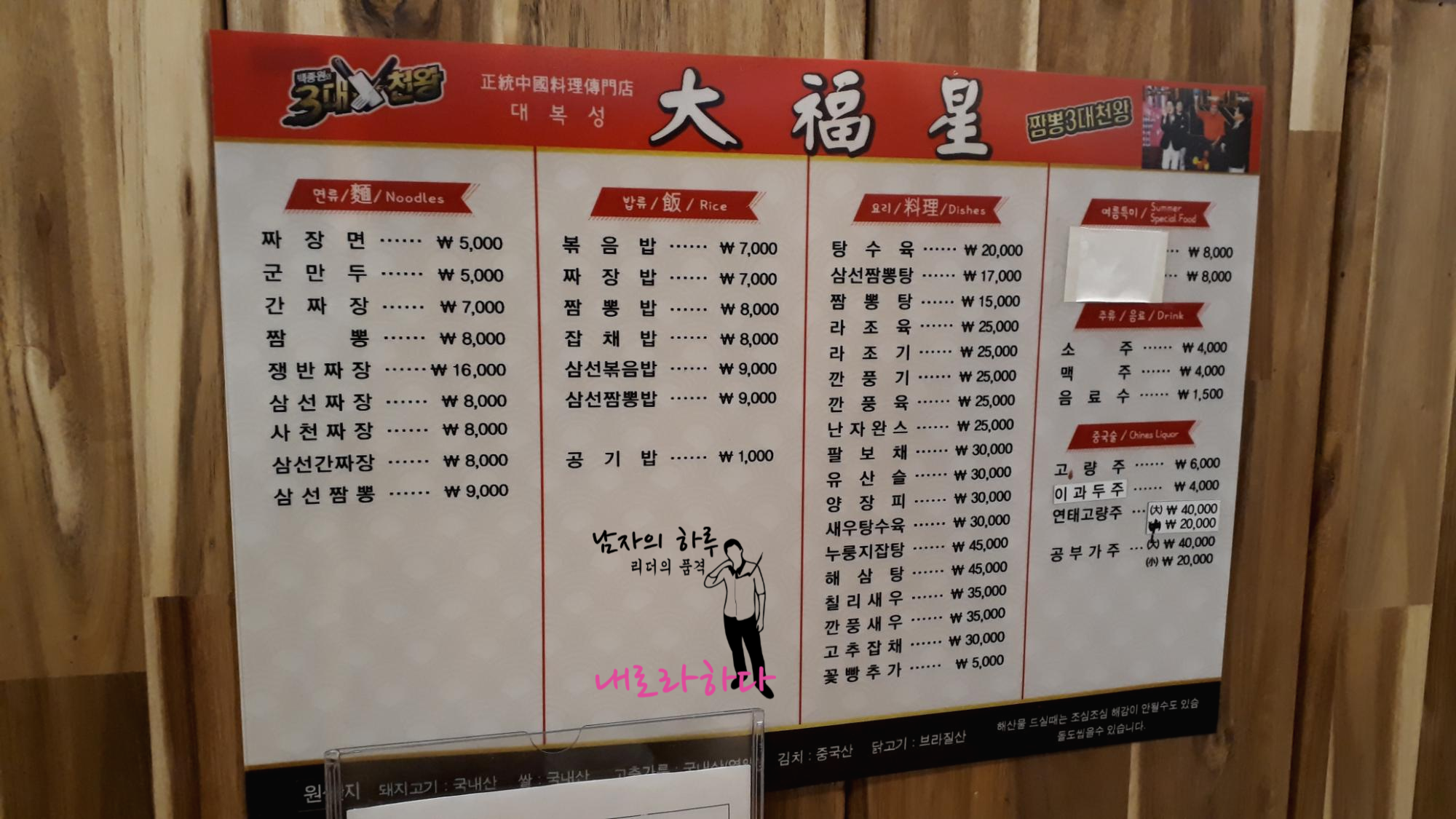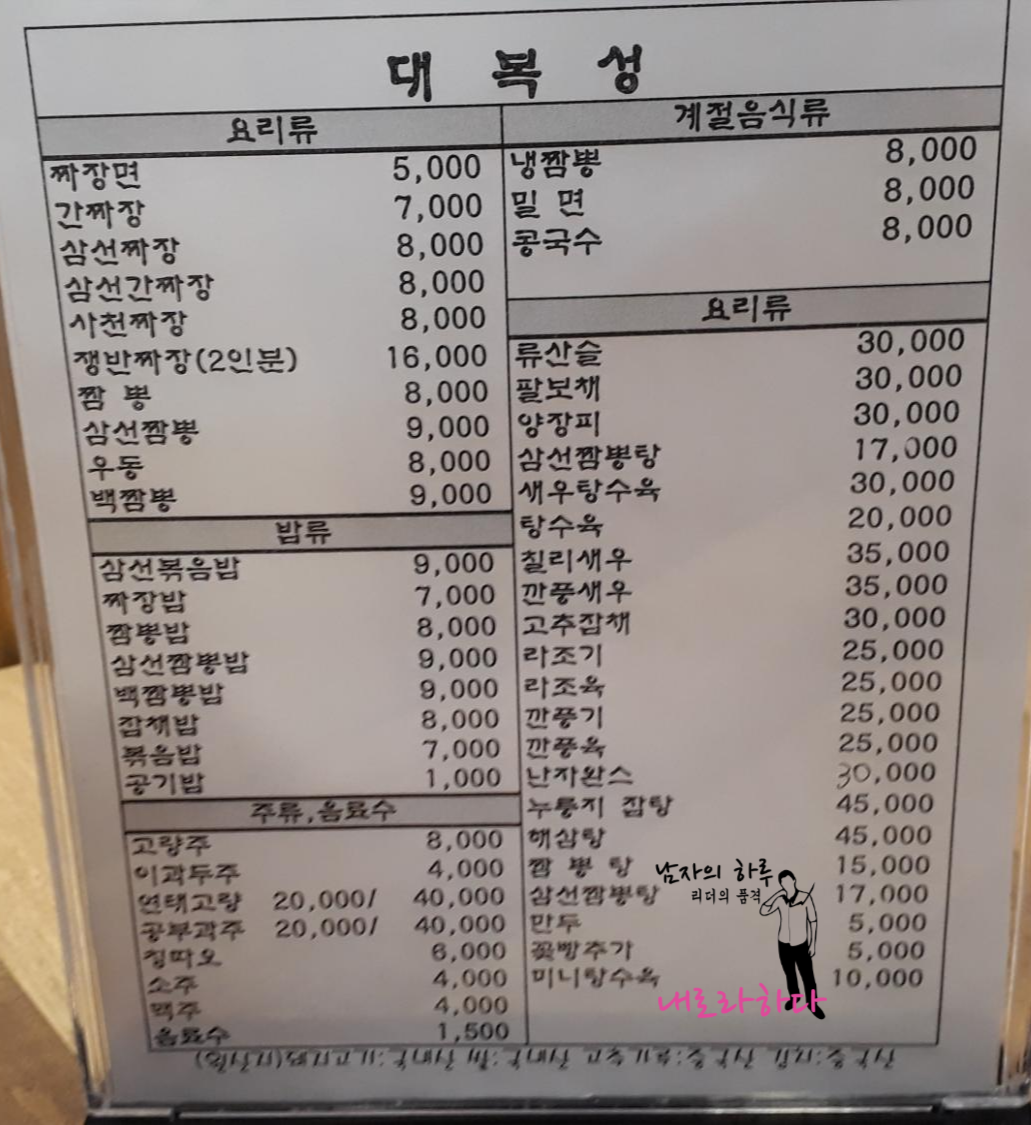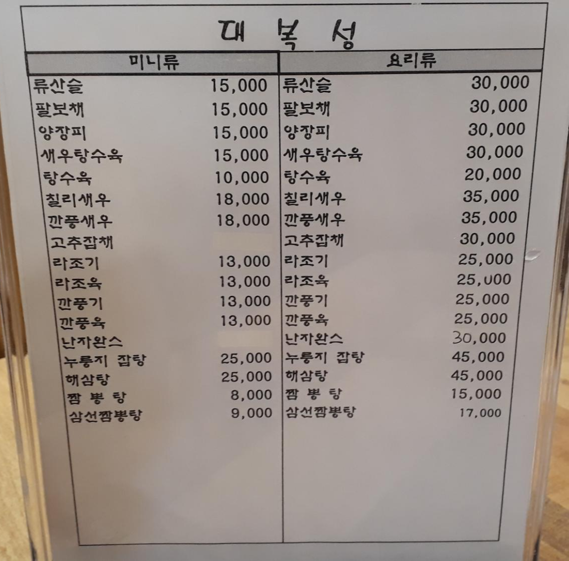 대복성의 메뉴판입니다. 짬뽕 3대 천왕답게 짬뽕이 비싼 편입니다.