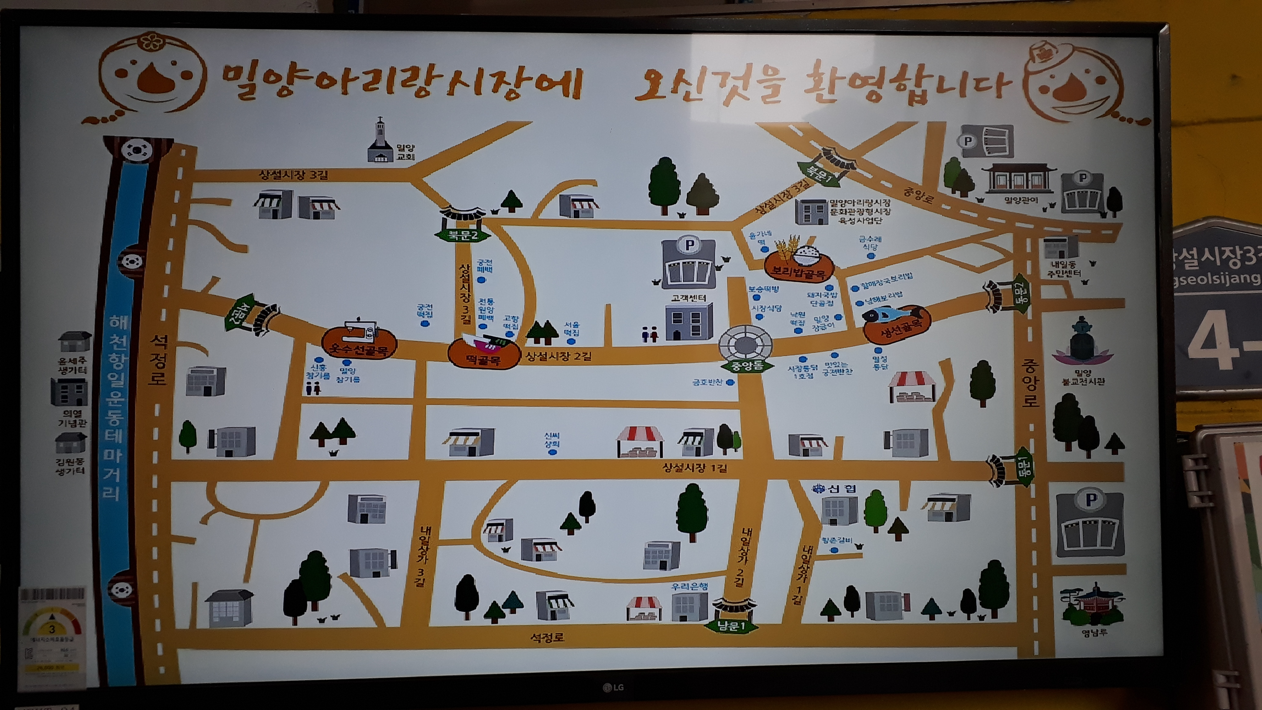 밀양시장은 옷수선 골목, 떡골목, 보리밥 골목, 생선골목으로 크게 4개의 골목으로 이루어져 있습니다.