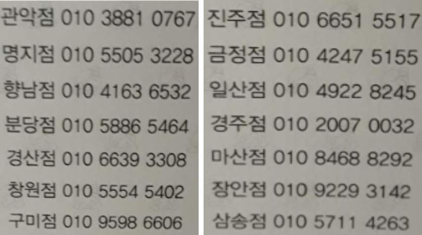 관악점 010-3881-공칠육칠, 명지점 010-5505-삼둘둘팔, 향남점 010-4163-육오삼이, 분당점 010-5886-오사육사, 경산점 010-6639-삼삼공팔, 창원점 010-5554-오사공이, 구미점 010-9598-육육공육, 진주점 010-6651-오오일칠, 금정점 010-4247-오일오오, 일산점 010-4922-팔리사오, 경주점 010-2007-공공삼이, 마산점 010-8468-팔리구이, 장안점 010-9229-삼일사이, 삼송점 010-5711-사이육삼