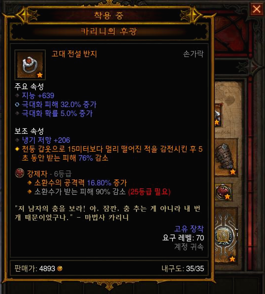 반지 하나는 원소의 회동을 착용하였고 옵션은 극확 극피 지능으로 맞춘후 보석은 갇힌자의 파멸을 껴줬습니다 25등급이죠