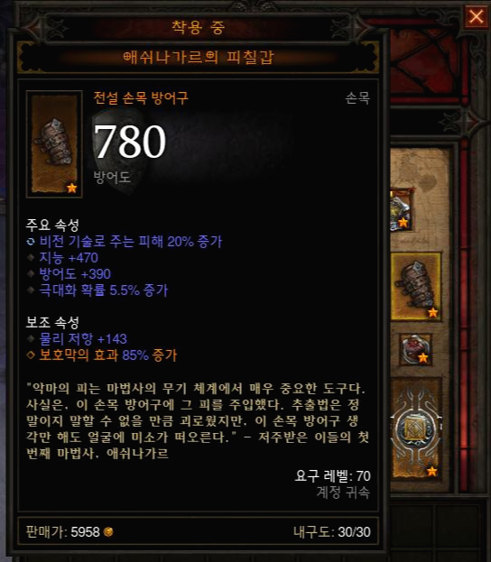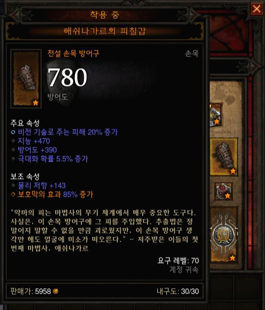 마법무기 룬중에 공격시 생명력의 %만큼 보호막을 얻는 옵션이 있는데 여튼 그 보호막의 효과를 올리기 위해 저아이템을 껴줍니다