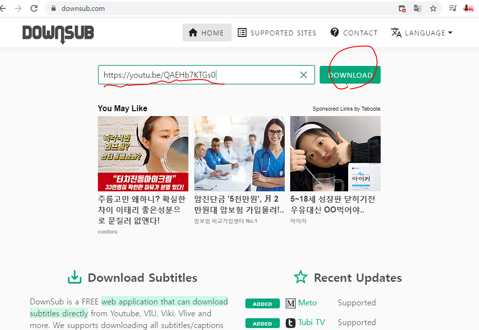 10. 새창을 띄운 후, 자막 번역 무료 다운 사이트(downsub.com)로 들어갑니다. 아래와 같이 복사한 링크를 붙여넣기한 후에 우측의 다운로드 DOWNLOAD 버튼을 클릭합니다.