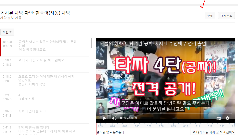 4. 아래와 같이 좌측에 미리 게시된 한글?자막을 확인할 수 있습니다. (만약 자막이 나오지 않는다면 설정에 가서 자막을 허용해야 합니다.) 보시다시피 한국어 음성을 알아듣고 자동으로 게시된 자막은 오타가 심각한 수준입니다. 그러므로 우측 상단의 수정을 누르고 수정합니다.(한글 자막을 먼저 달아야 나중에 영어 자막을 달 수 있습니다. 팁. 한글 자막은 나중을 위해 번역이 쉽도록 다는게 좋습니다.)