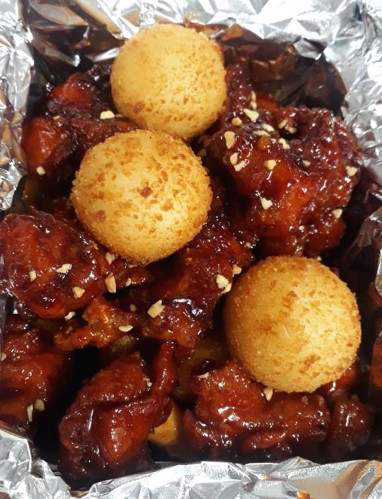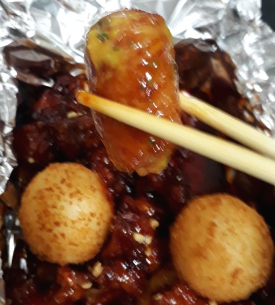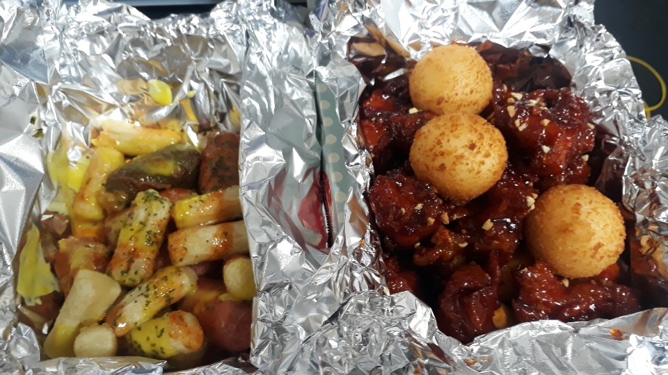왼쪽이 소떡소떡이고 오른쪽이 닭강정이고 닭강정 위에는 서비스 치즈볼도 3개 올려져 있는 모습입니다