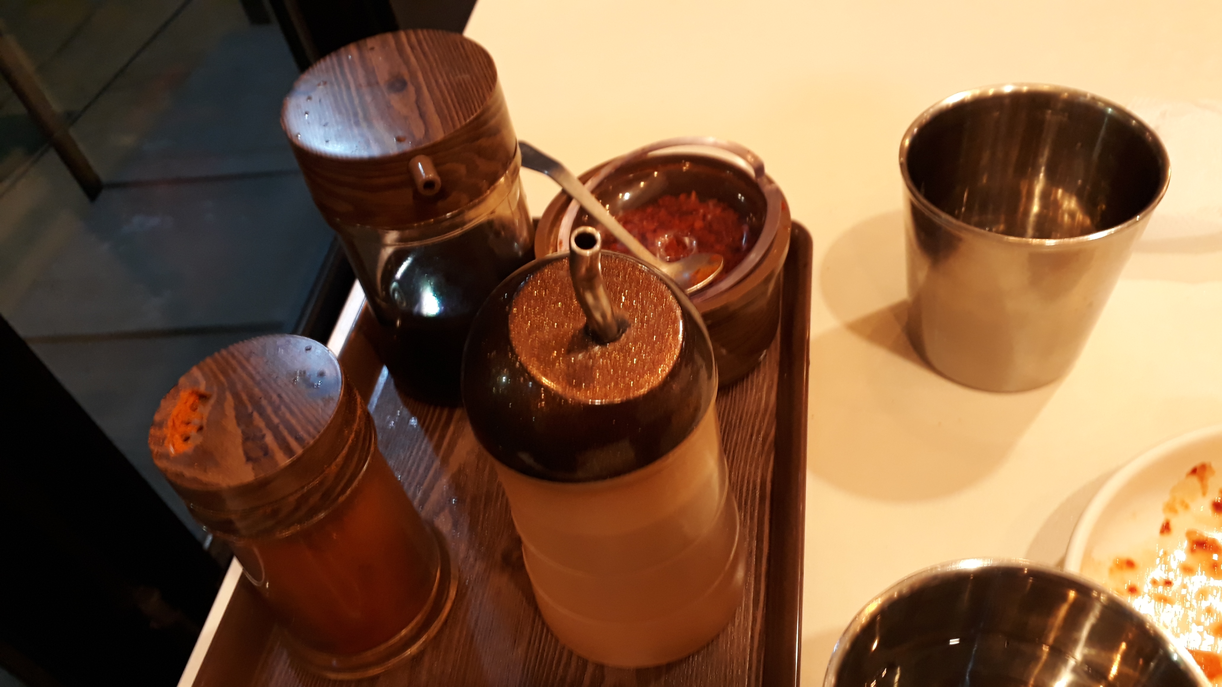 전반적으로 청결하나 앞에 손님께서 얄밉게도 고춧가루 뚜껑을 뒤집어 놓고 가셨군요. 식당에서도 바쁘셔서 그런지 신경을 못 쓰신 모양입니다. 늘 꼼꼼하게 챙기는게 쉽지는 않죠. 잘하다가 한번 빼먹을 때도 있으실테고 그래서 다시 뒤집어 드리고 왔습니다.