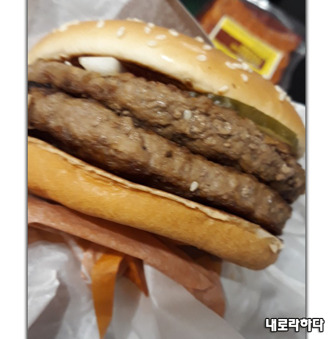 포장지를 벗기면 눈에 보이는 건 패티 2개와 우람한 크기의 버거입니다.