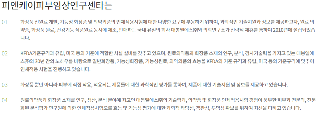아래에서 피엔케이 피부 임상연구 센타라는 곳을 찾아보니 2010년에 설립된 곳입니다. 대봉엘에스(주)가 30년의 업력을 지닌 곳인데 중앙대 의학연구소와 전략적 제휴를 통해 설립되었습니다.