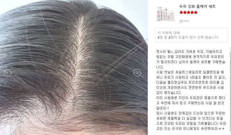 눈에 띄는 효과는 없지만 두피가 건강해진 것 같다네요. 두 번째 구입하시는 분입니다.